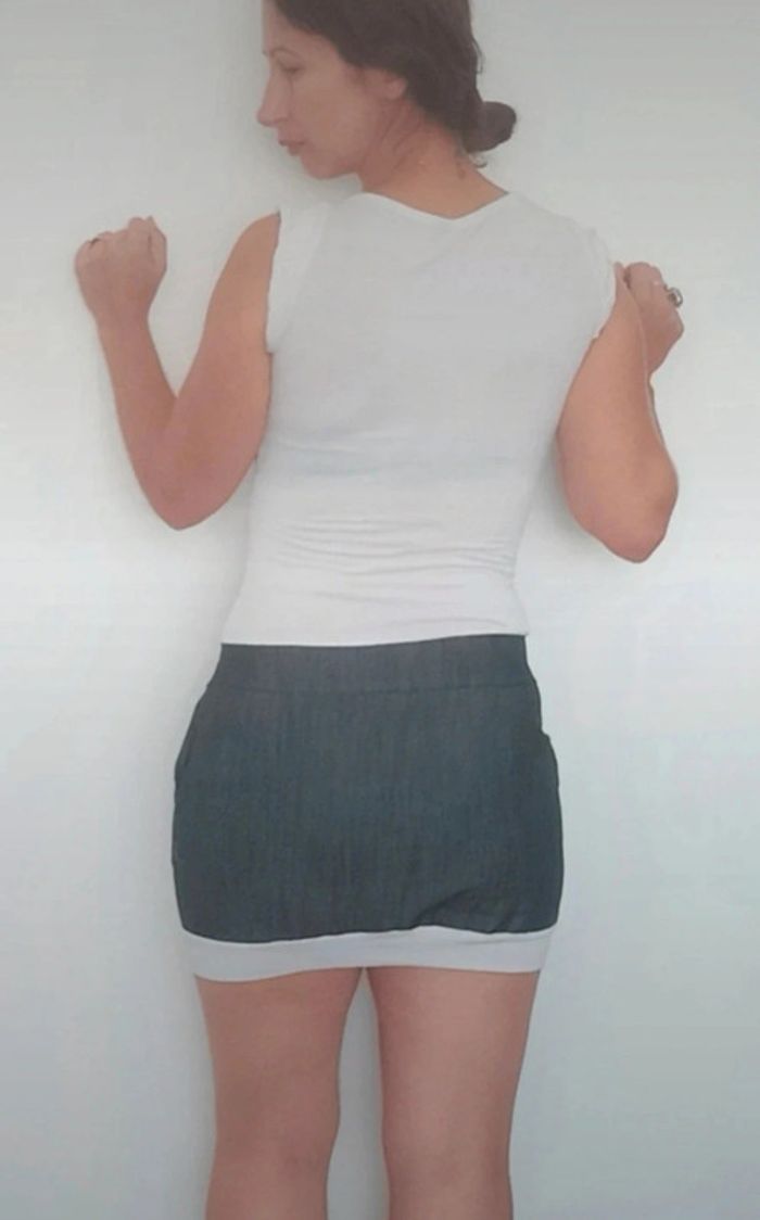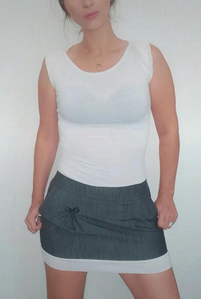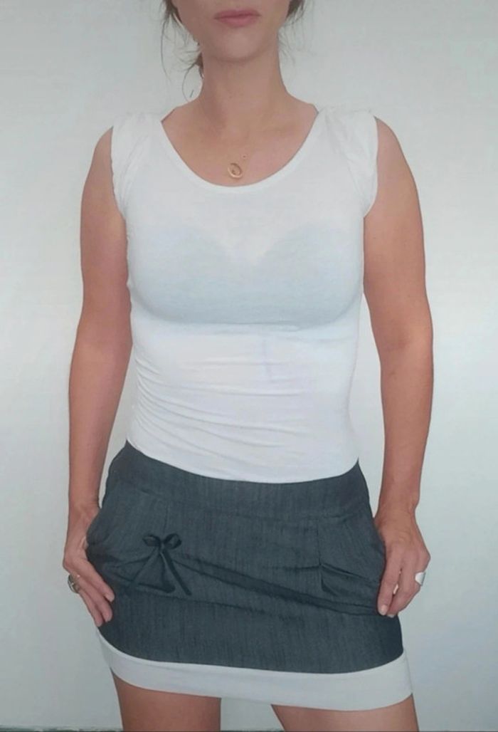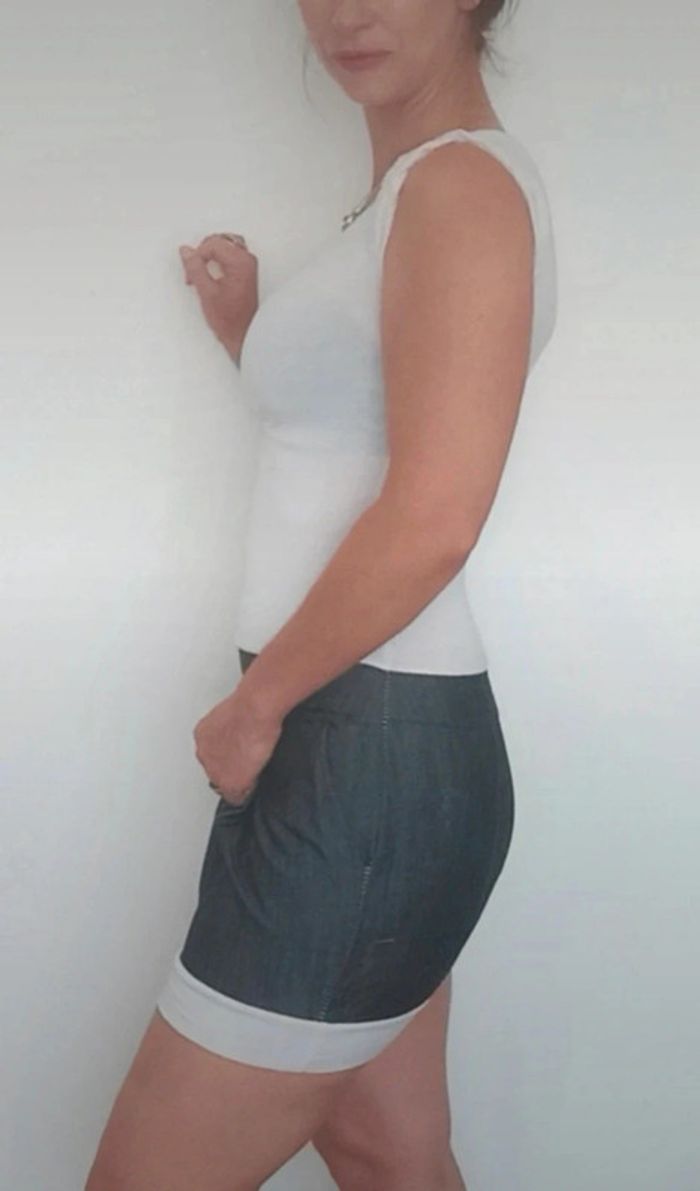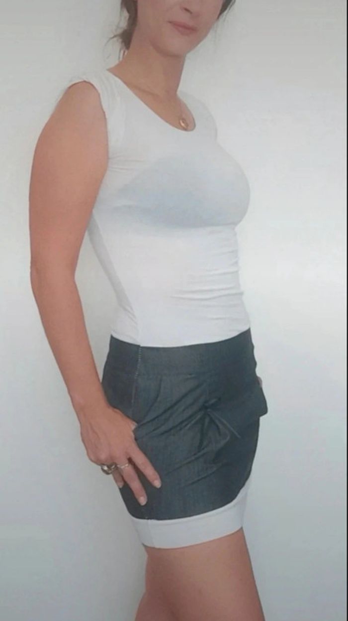 Regardez mes autres articles dans votre taille pour grouper les fdp #poupoupidoutu Robe casual haut t-shirt moulant blanc manches courtes bas jupe mini légèrement boule effet jean brut, féminine et intemporelle, made in Italy, taille unique max 38! #robeete #minirobe #robecasual #robeboule #robetshirt #robeintemporelle #robemimi #robeete #ribebabydoll
