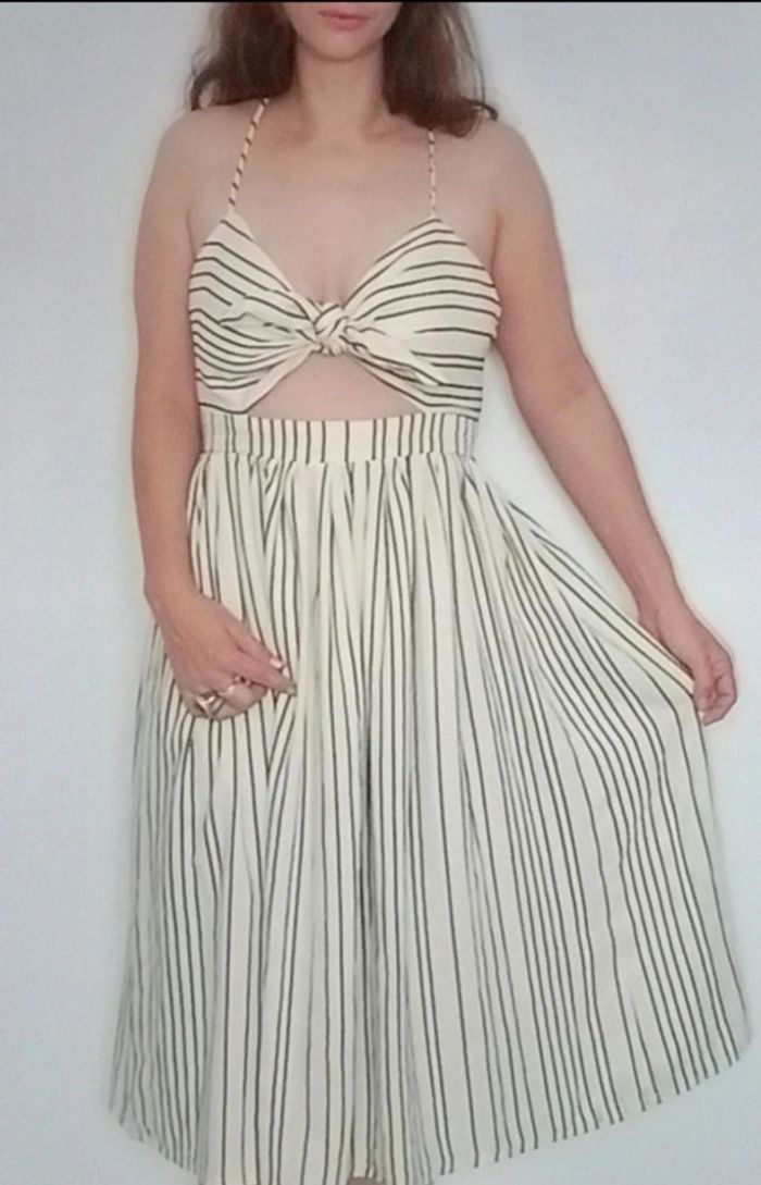 Regardez mes autres articles dans votre taille pour grouper les fdp #poupoupidou38 Robe d été mi longue haut à noeud sur poitrine, ouvert, bas jupe taille haute évasée fluide, crème rayée, style pinup et casual #robeete38 #roberayee38 #robeouverte38 #robecasual38 #robepinup38 #robesweet
