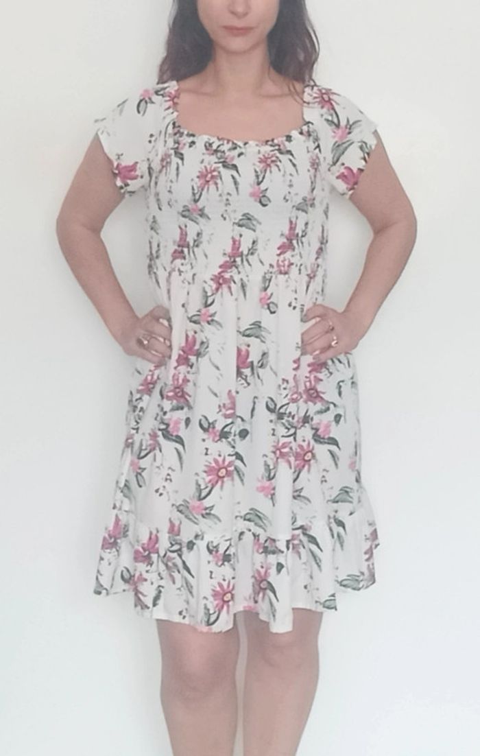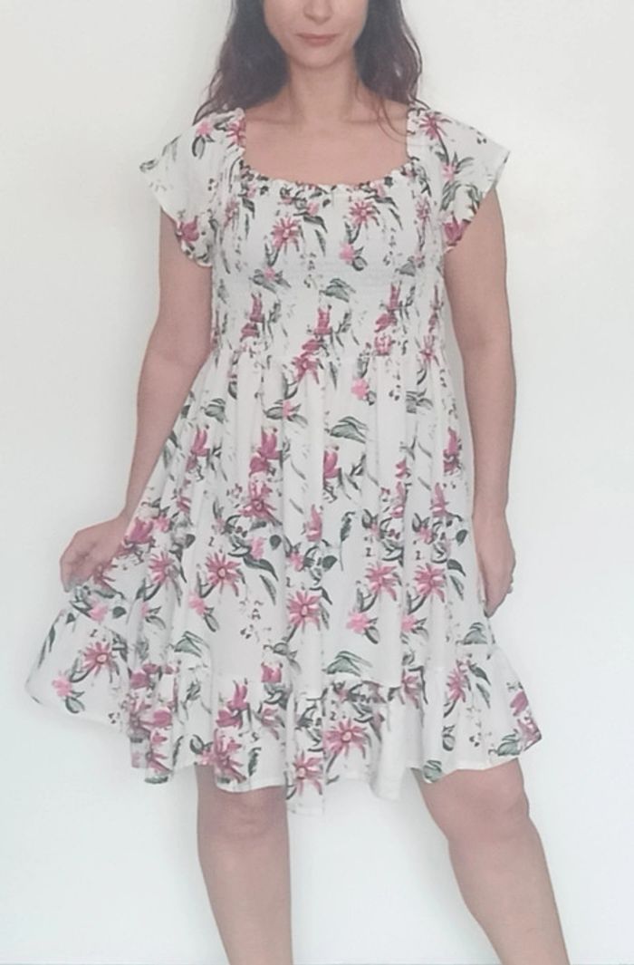 Regardez mes autres articles dans votre taille pour grouper les fdp #poupoupidou44 Robe d été blanche motif fleuri, manches courtes, smockée au buste, jupe évasée fluide, confortable et féminine #robeete44 #robe44 #robefleurie44 #roberomantique44 #robecasual44 #robecourte44 #robexxl