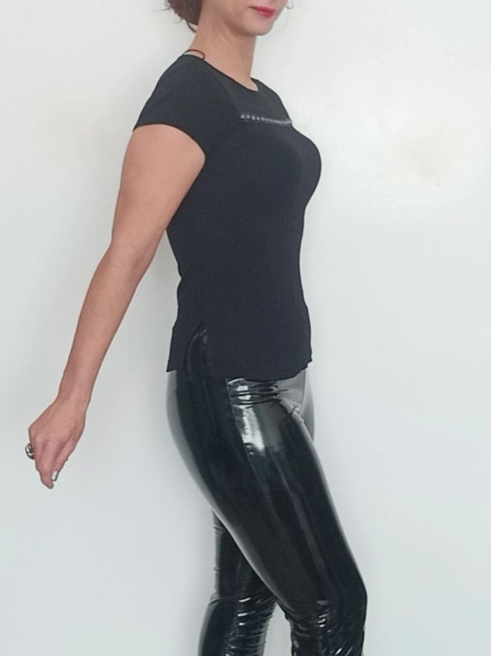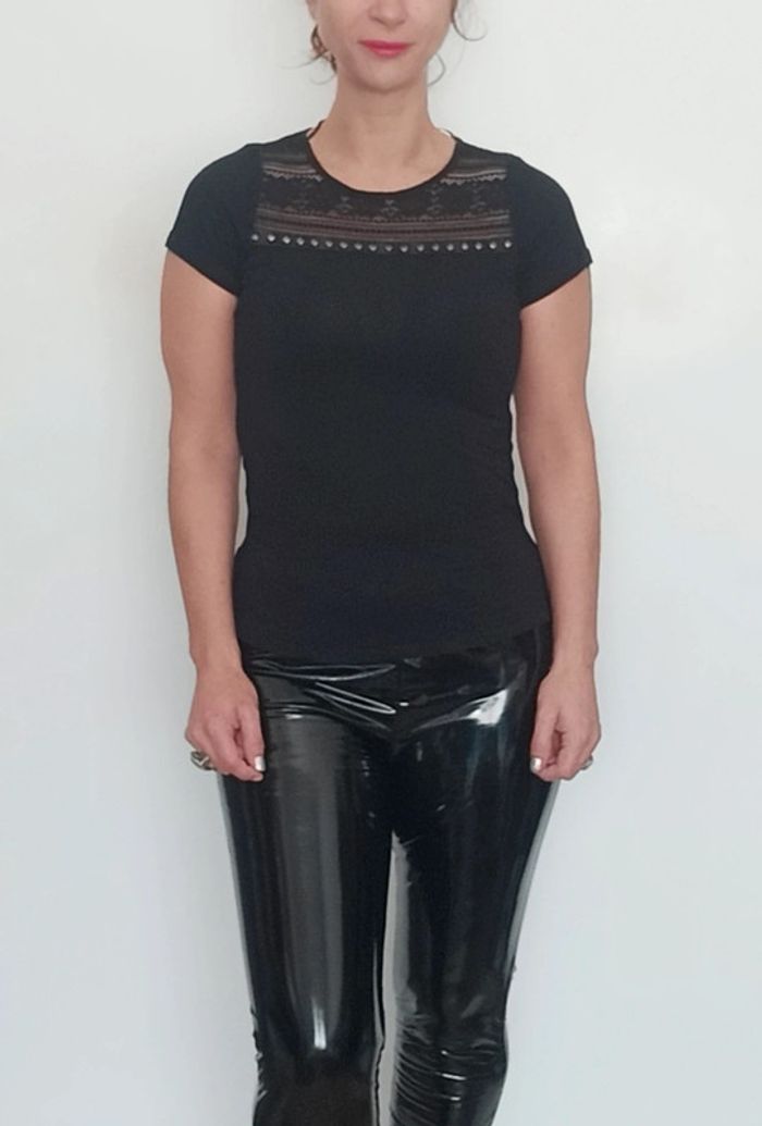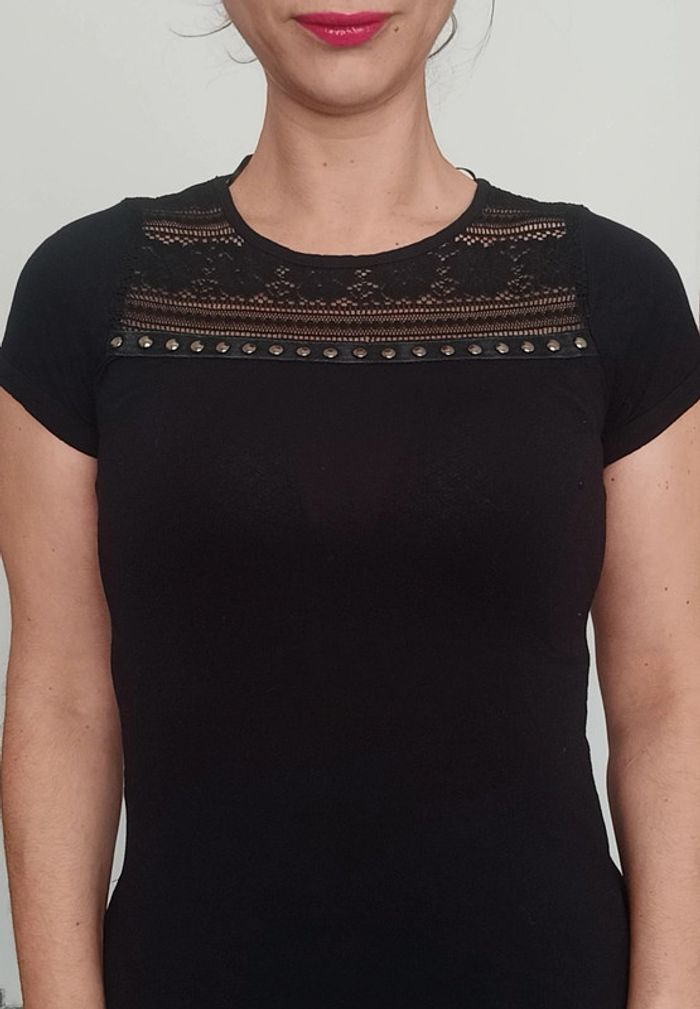 Regardez mes autres articles dans votre taille pour grouper les fdp #poupoupidou36 T-shirt ajusté uni noir détail clouté et dentelle / crochet en haut du buste, facile a porter et a assortir, marque Atmosphère #tshirt36 #haut36 #hautnoir36 #hautatmosphere36 #hautgoth36 #hautbaroque36 #hautcloute36 #hautgothique36