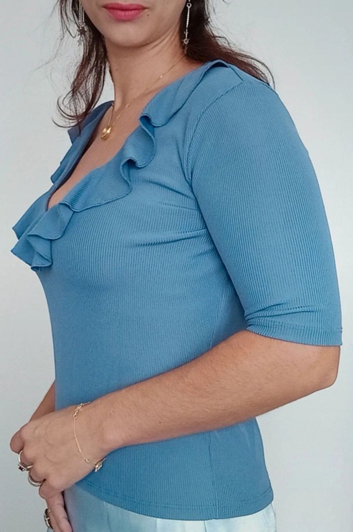 Regardez mes autres articles dans votre taille pour grouper les fdp #poupoupidou40 Haut moulant manches trois quarts, matière fine côtelée, décolleté arrondi et volante féminin, uni bleu.moyen facile a assortir marque #stradivarius40 #hautstradivarius40 #hautfeminin40 #hautdecollete40 #hautvolante40 #hautvolants40 #hautmanchestroisquarts40 #hautsexychic40 #hautcotele40