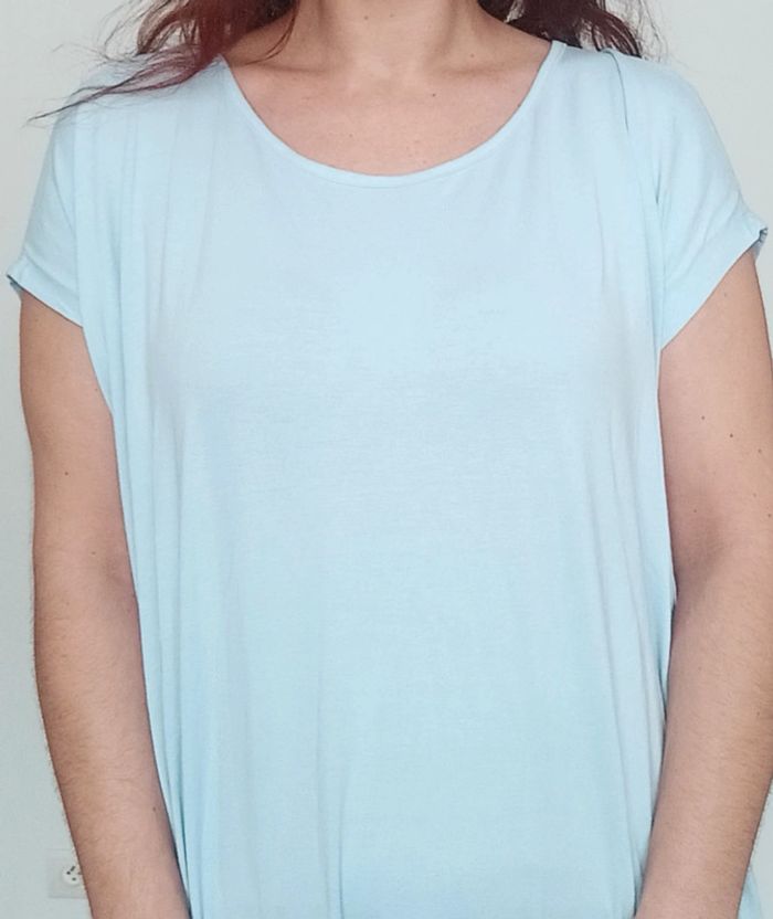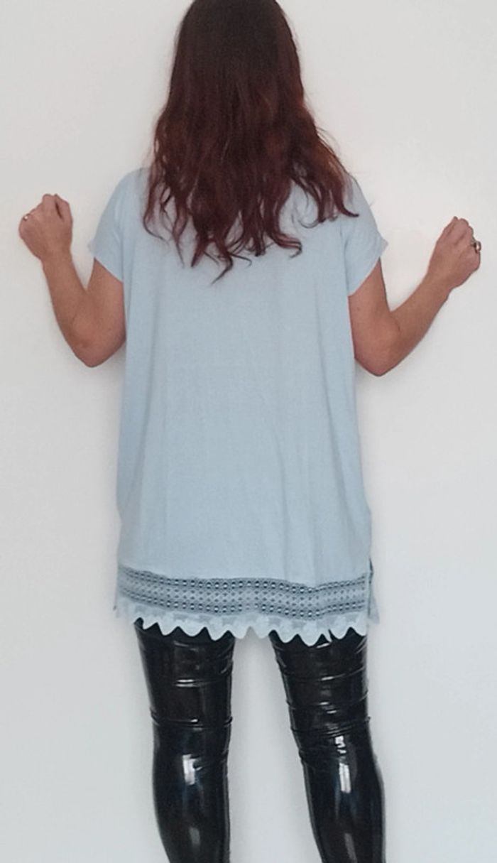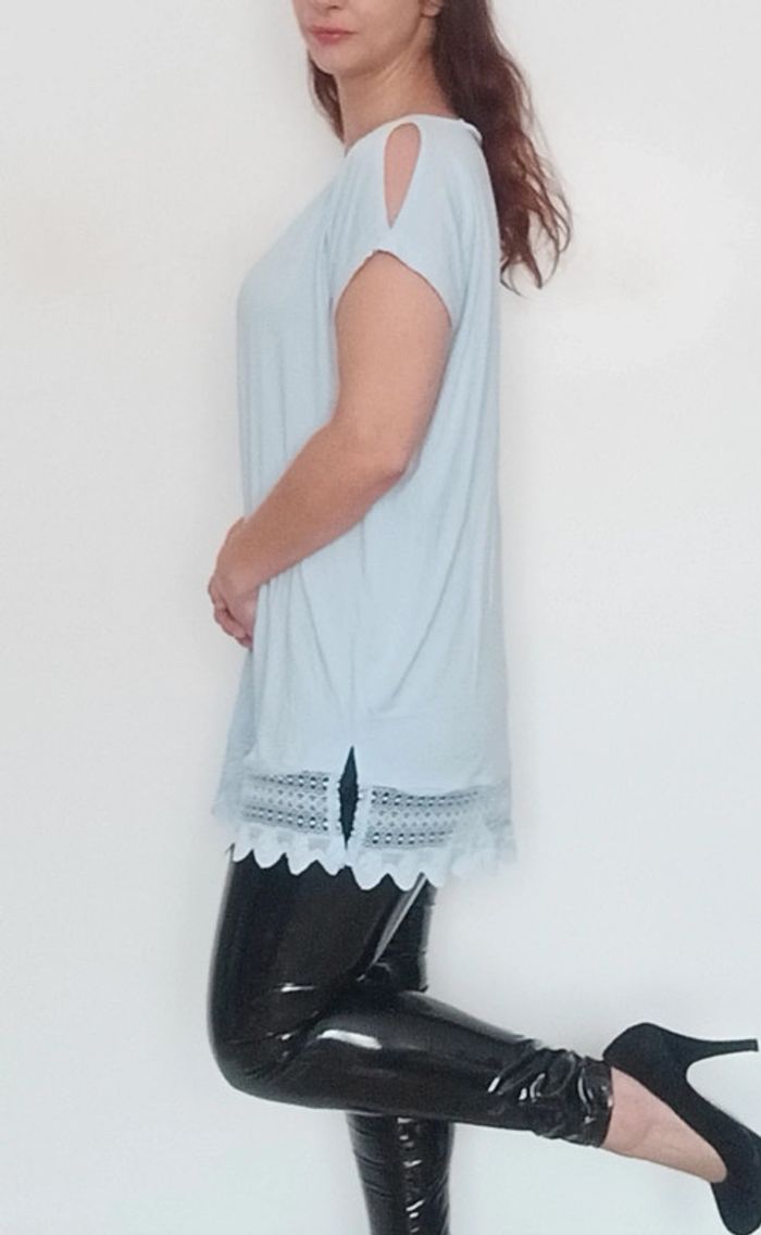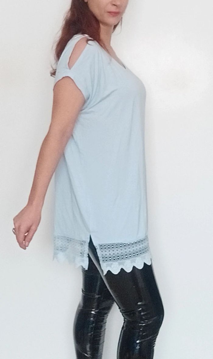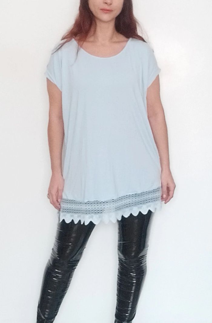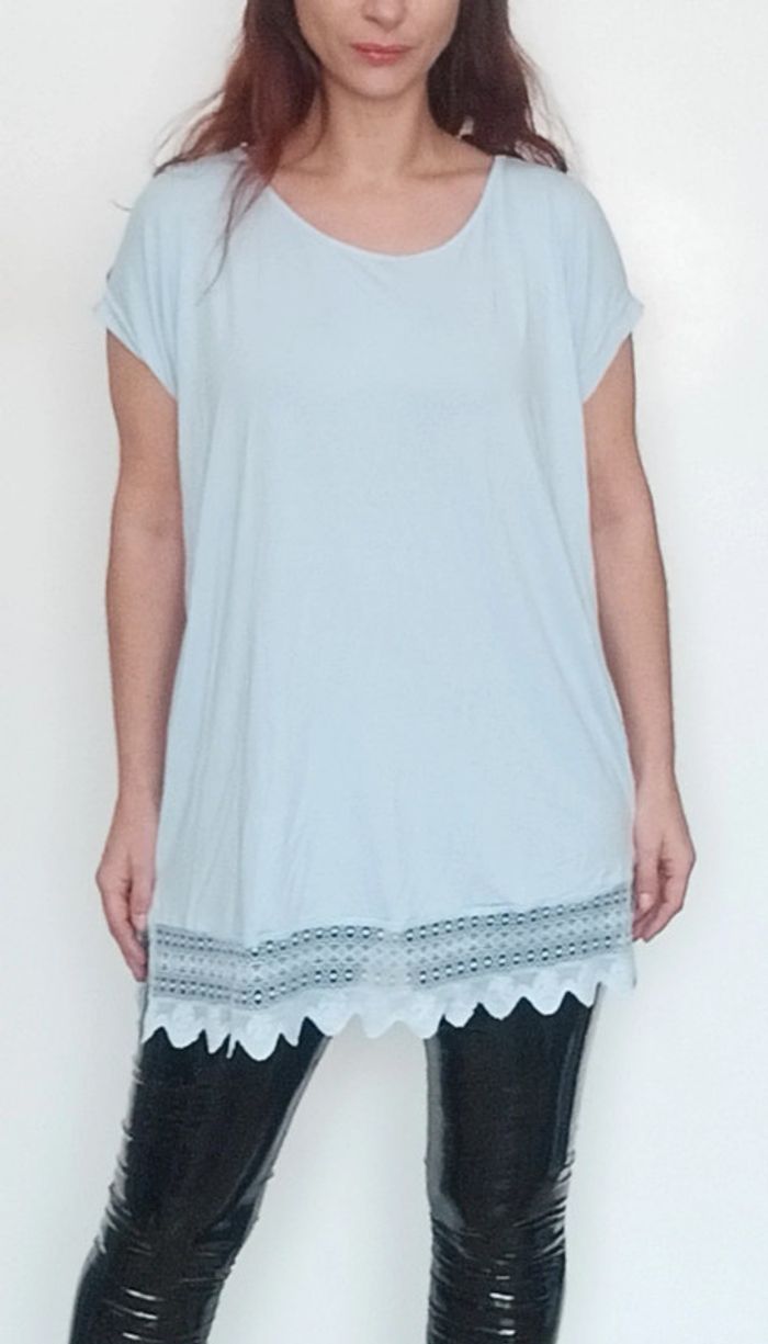 Tunique matière t-shirt , manches courtes, unie bleu ciel fluide bas crochet dentelle, fluide, confortable et feminine #tunique4648 #tuniquepastel46 #tuniquecasual46 #tshirtlong4648 #tunique3xl