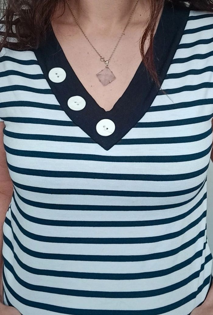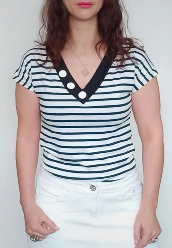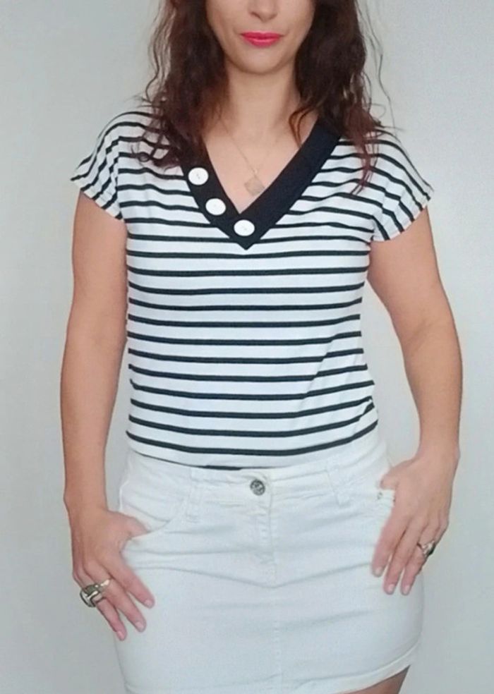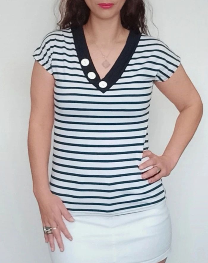 Regardez mes autres articles dans votre taille pour grouper les fdp #poupoupidou38 Haut manches courtes rayé façon marinière noir et blanc, col V détail boutons décoratifs, sympa, facile a porter et a assortir, intemporel, #tshirtmariniere38 #mariniere38 #hautraye38 #hautete38 #tshirtraye38