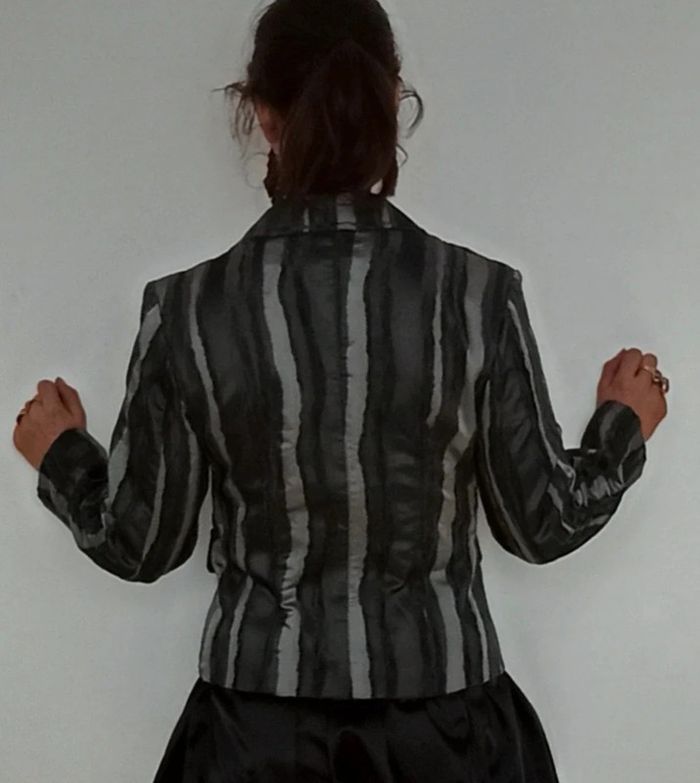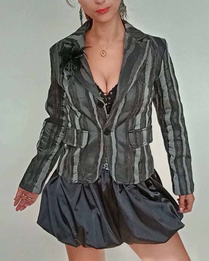 Regardez mes autres articles dans votre taille pour grouper les fdp #poupoupidou40 Veste blazer rayée chic idéal soirée, avec dentelle et broche plume, style pinup, facile a assortir #vestesoiree40 #blazersoiree40 #blazer40 #blazerchic40 #vestechic40 #vestedentelle40 #blazerdentelle40 #blazerraye40