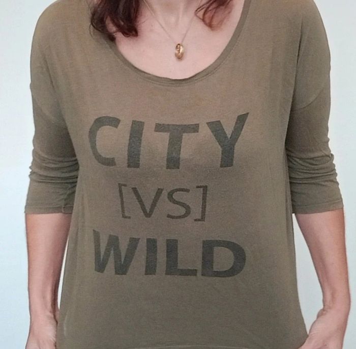 Regardez mes autres articles dans votre taille pour grouper les fdp #poupoupidou36 Haut manches trois quarts, casual, loose et doux, texte "city vs wild" sympa et facile a porter et a assortir #hautkaki36 #hautloose36 #hautatexte #tshirtatexte #hautcasual36