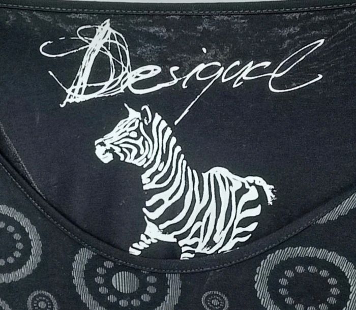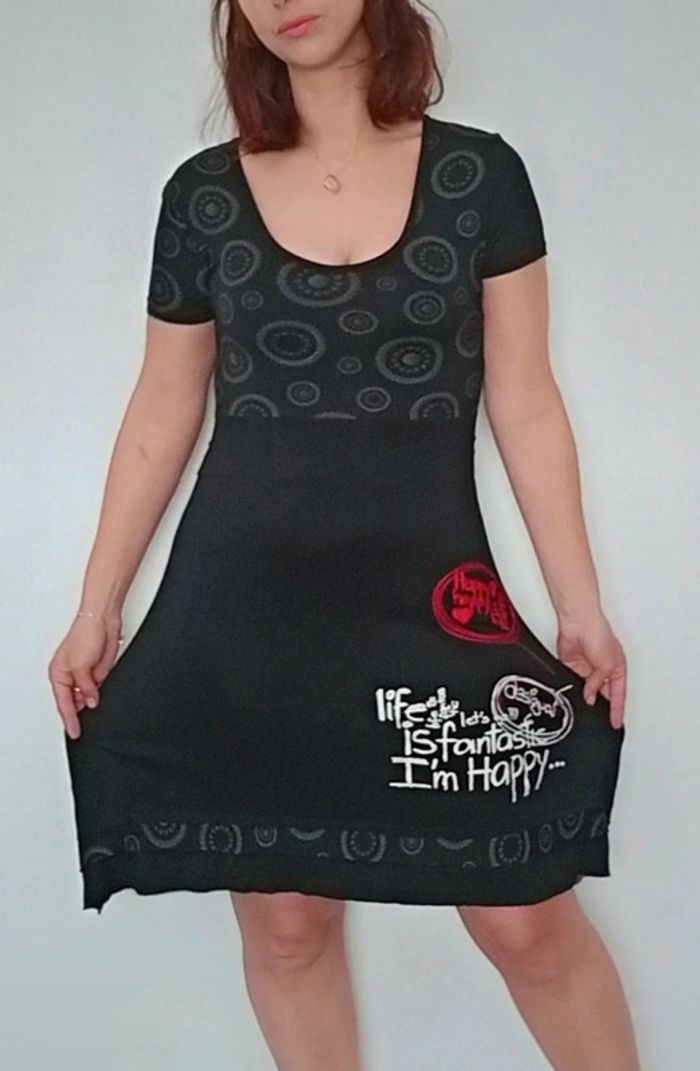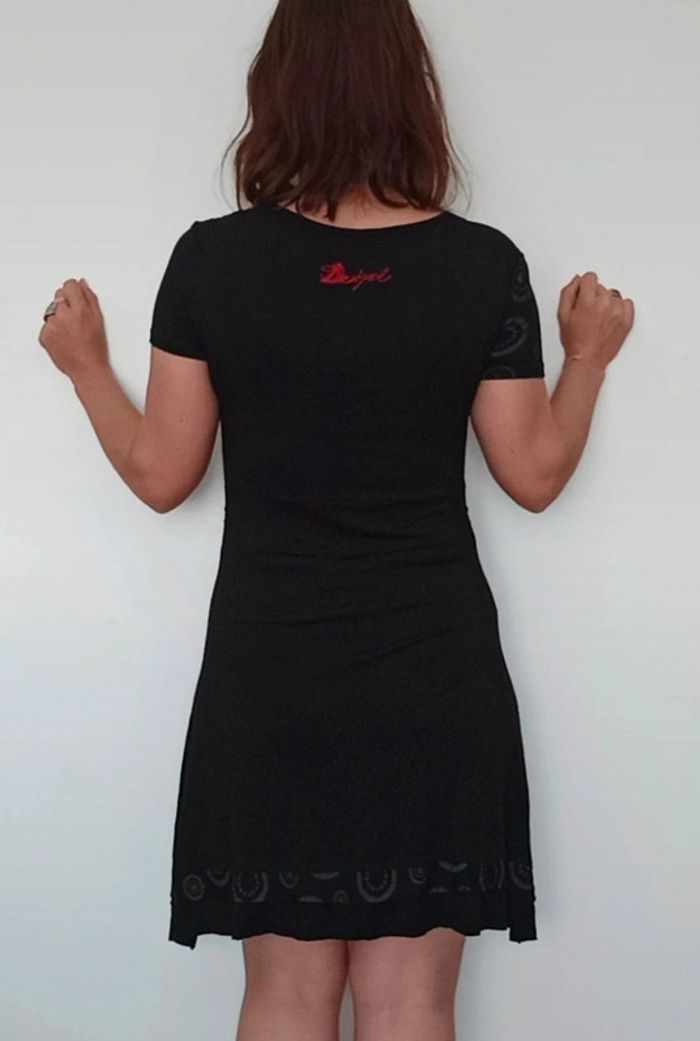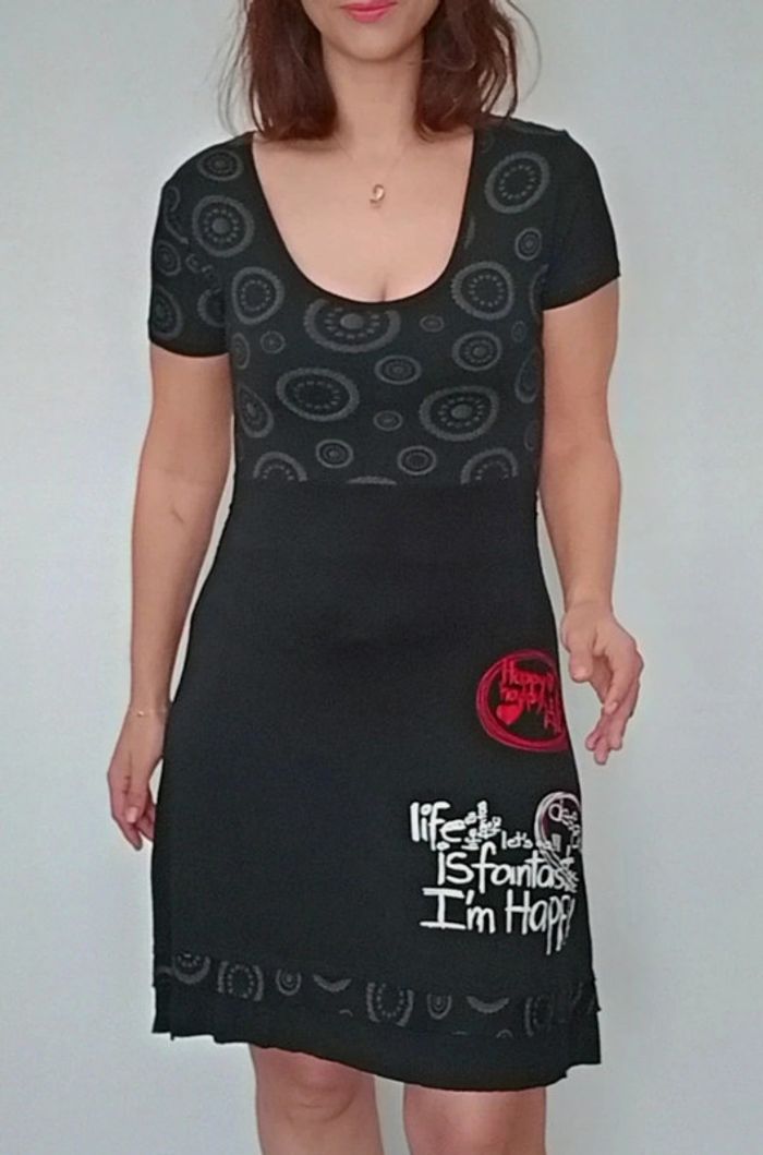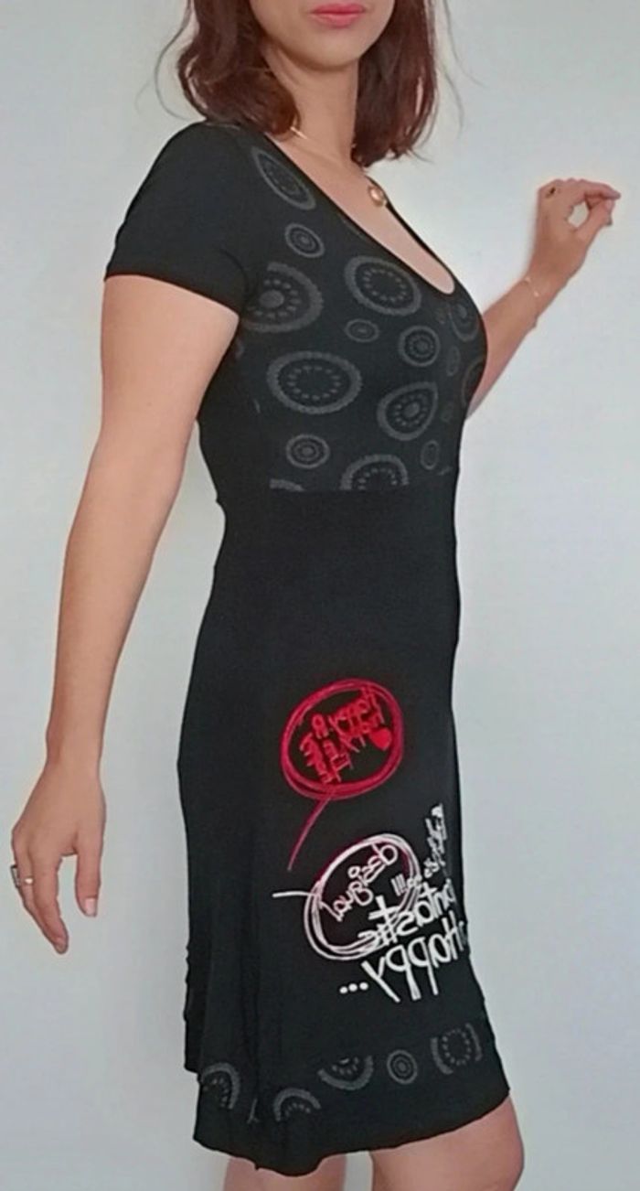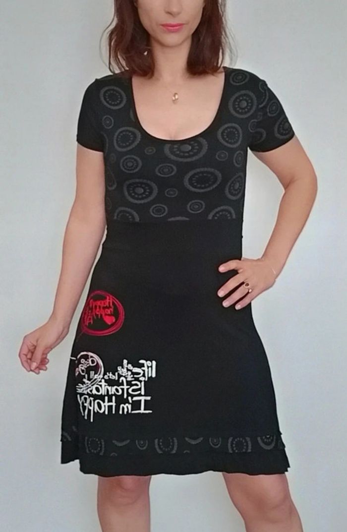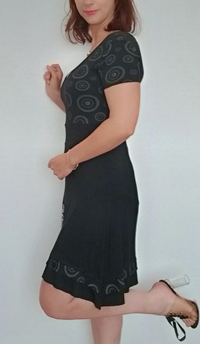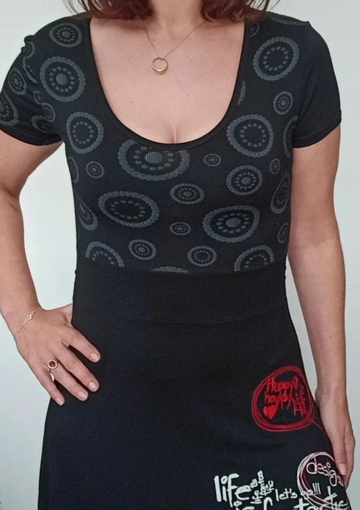 Robe longueur midi, haut décolleté arrondi manches courtes et jupe fluide, féminine et confortable, marque Desigual #robedesigual40 #robefeminine40 #robemidi40 #desigual40 #robedecolletee40 #petiterobenoire40 #robeprintemps40 #robecasual40