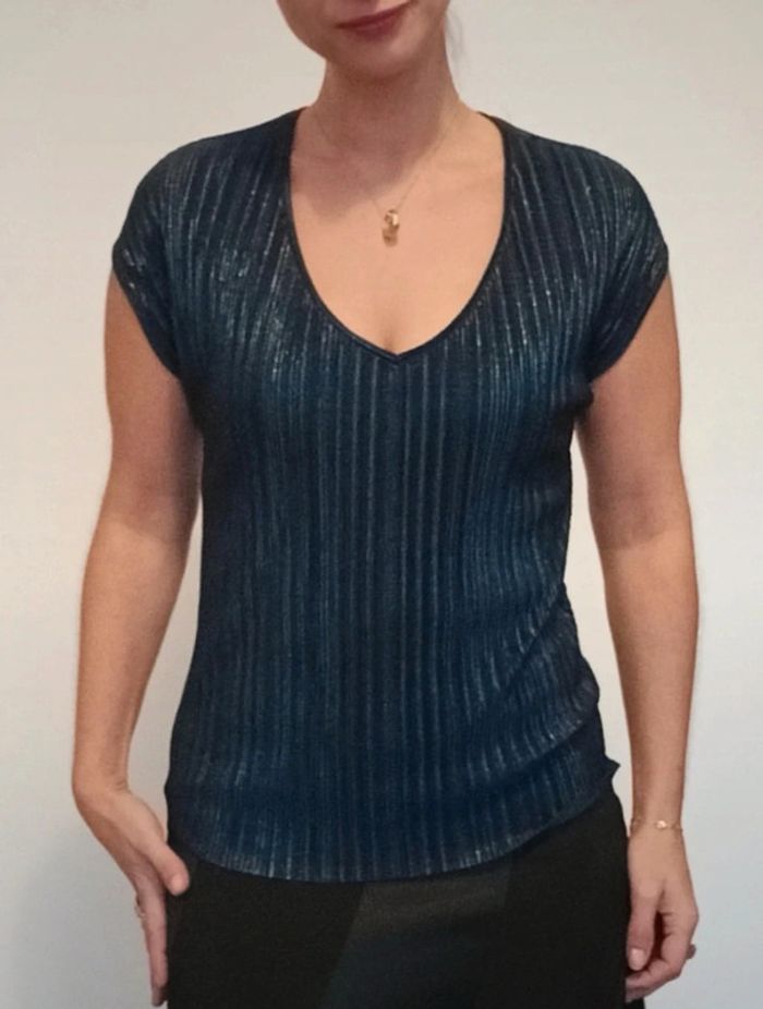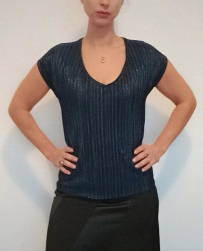 Regardez mes autres articles dans votre taille pour grouper les fdp #poupoupidoutu Haut gauffre léger idéal.soiree, décolleté en V, doux, confortable, irisé brillant, unie marine facile a assortir #hautgauffre #debardeursoiree #hautchic #hautirise #hautsoiree