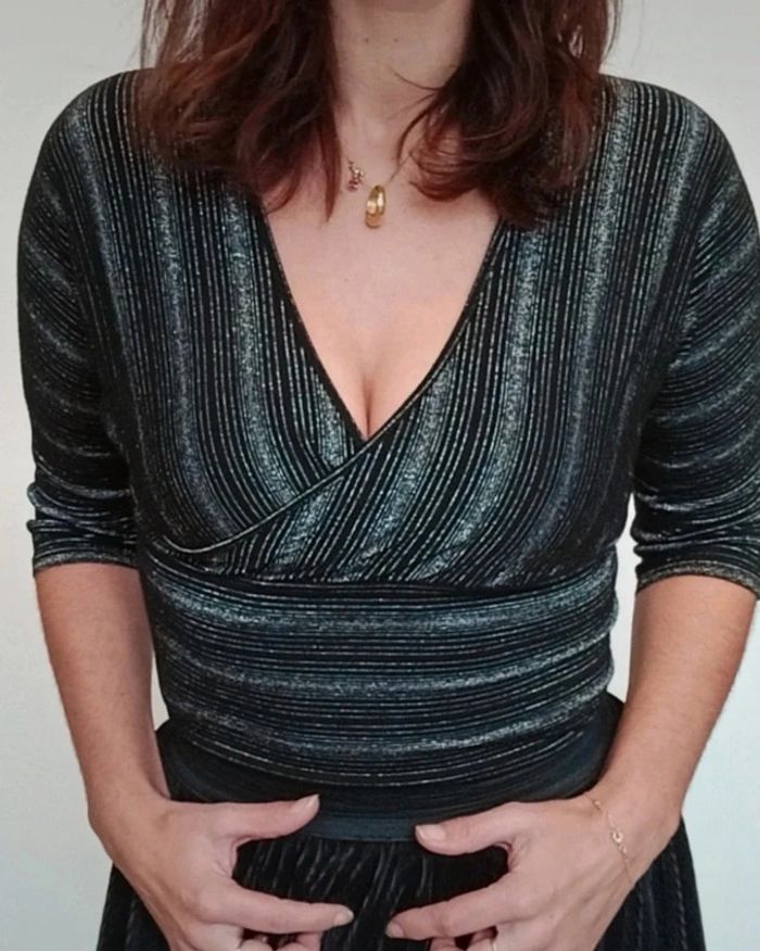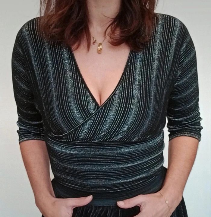 Regardez mes autres articles dans votre taille pour grouper les fdp #poupoupidou36 Beau haut forme cache coeur décolleté, manches trois quarts, moulant, noir pailleté argenté idéal soirée #hautpaillete36 #cachecoeur36 #hautdecollete36 #hautsoiree36 #hautchic36 #hautcachecoeur36 #hautnoiretargent #hautnoiretargente