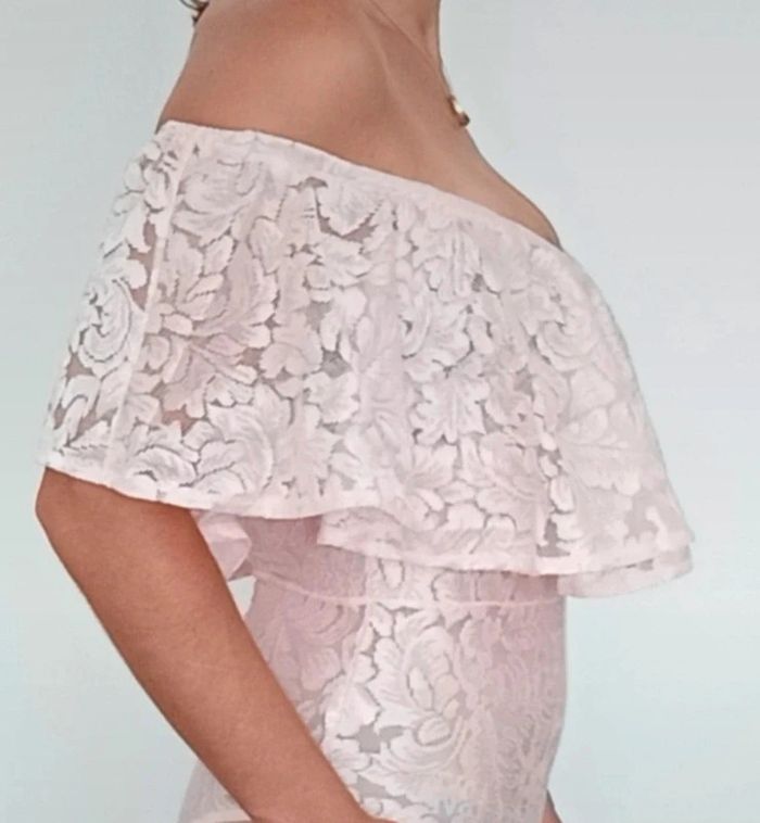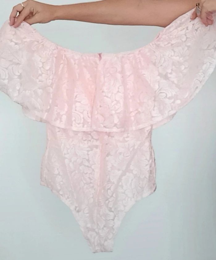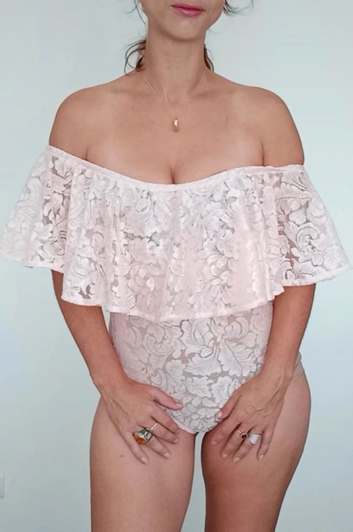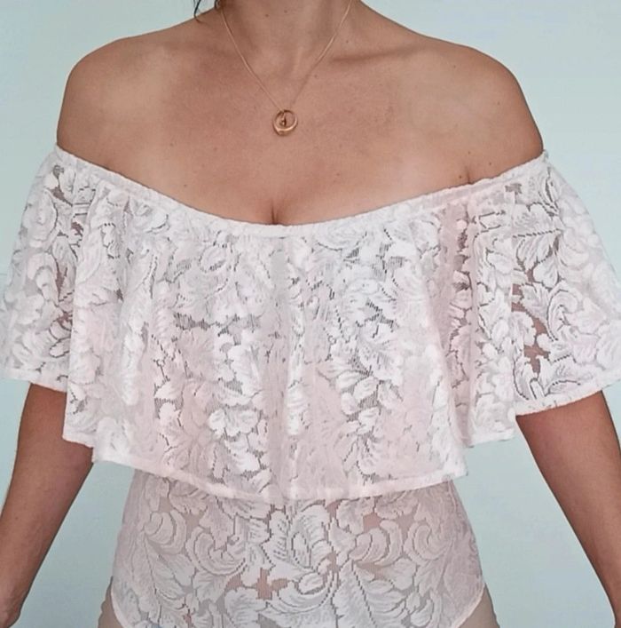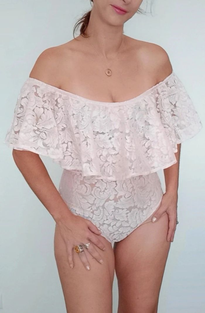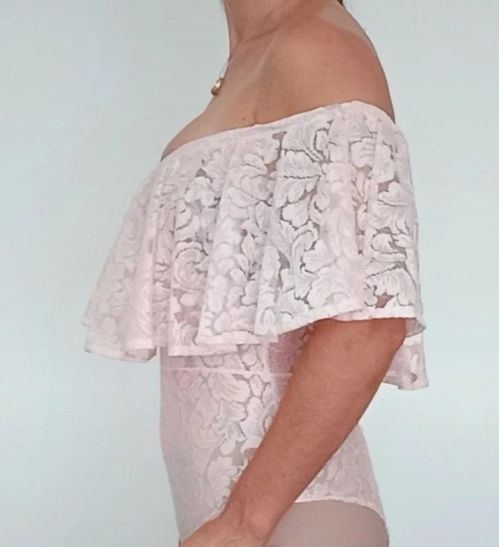 Body en dentelle rose poudré ajouré, grand volant et épaules nues, idéal événement, romantique et féminin, décolleté arrondi, TU convient idéalement aux 38 #bodydentelle #bodychic38 #bodyvolant #bodyvolant38 #bodypastel38 #bodyepaulesdenudees #bodyepaulesdecouvertes38 #bodysexy38 #bodyfetes38 #bodysoiree38