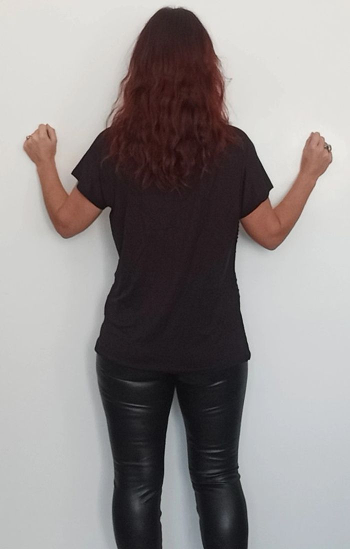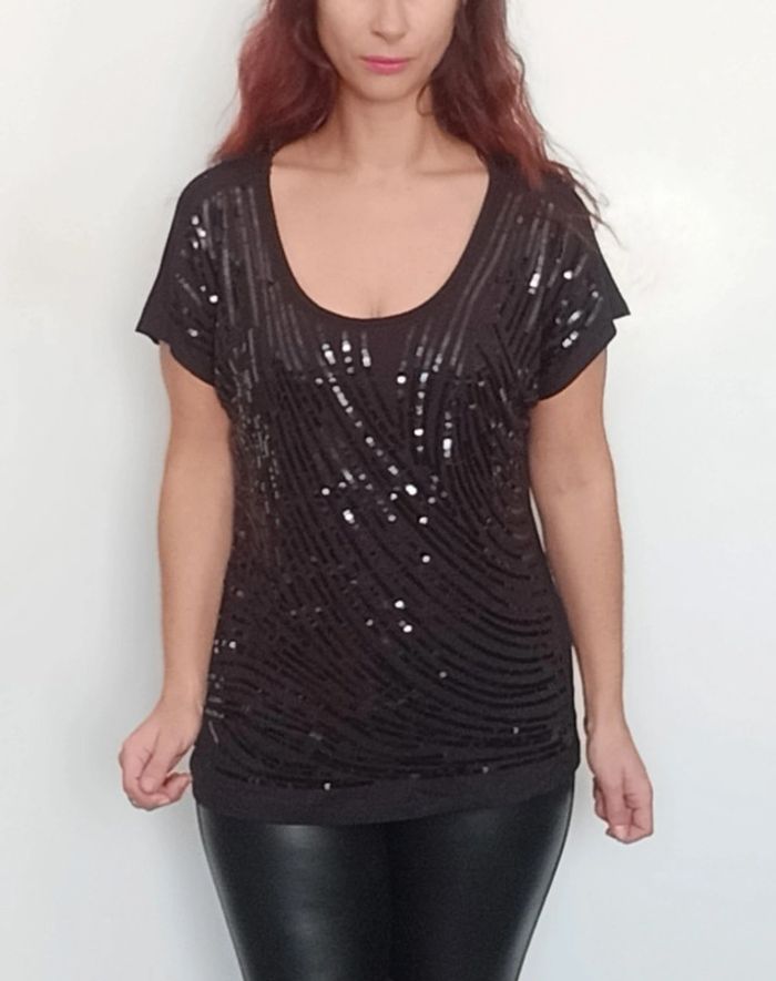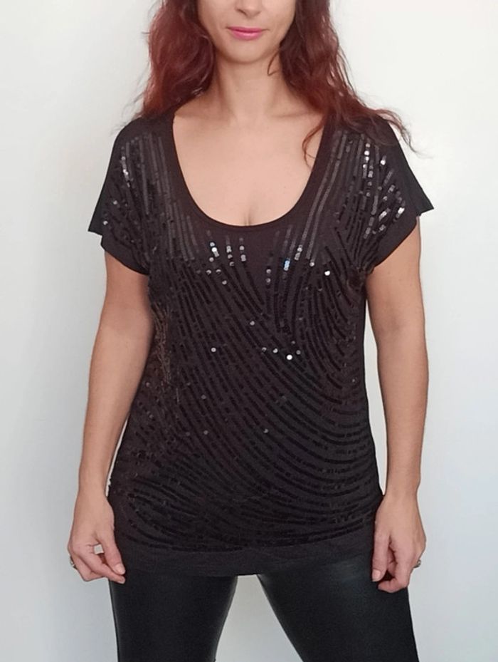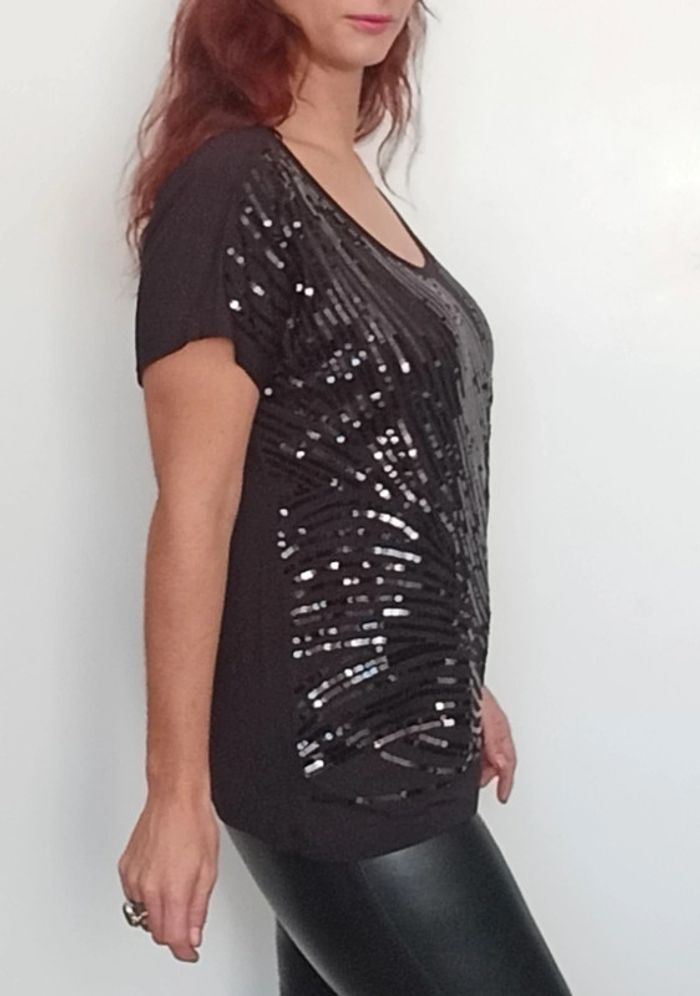Regardez mes autres articles dans cette taille pour grouper les fdp #poupoupidouxl #poupoupidou44 T-shirt uni noir avec sequins brillants noirs devant, manches courtes volantées, décolleté arrondi, idéal soirée ou fêtes, taille 4 (42 et 44) #tshirtsequins42 #tshirtsequins44 #topsequins4244 #hautsequins4244 #topsoiree4244 #hautfetes4244