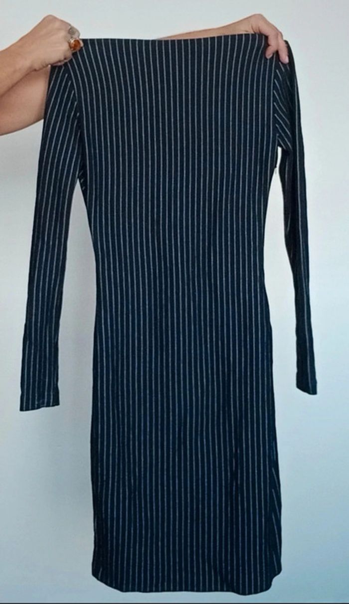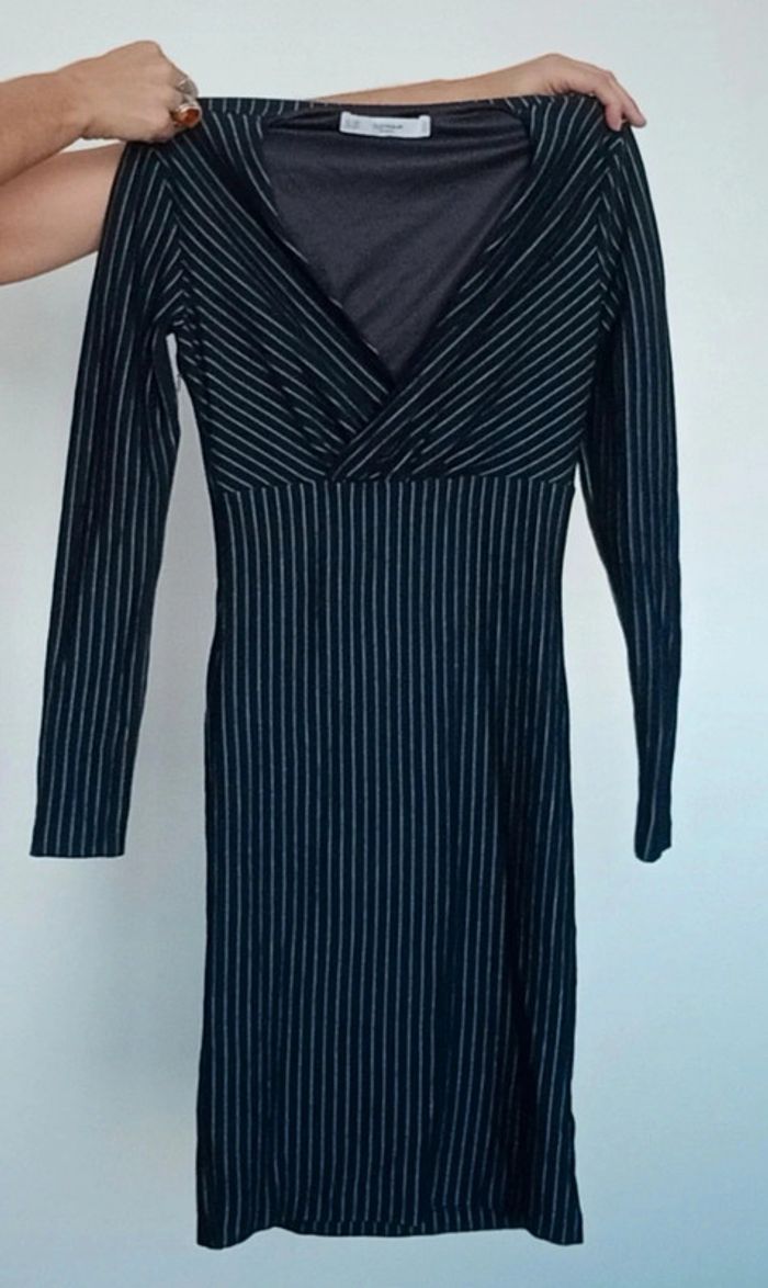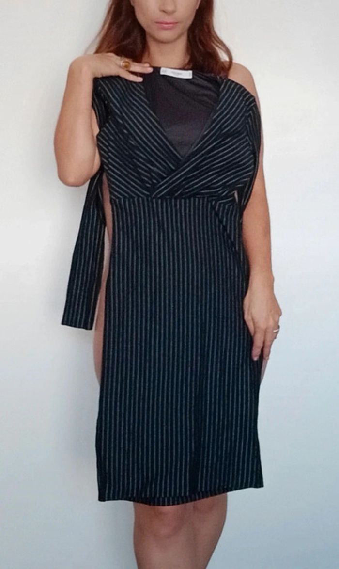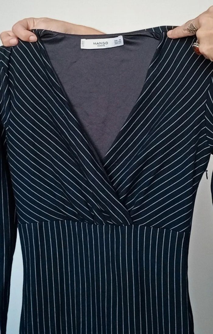 Robe d hiver chic mi longue, manches longues, buste forme cache coeur, noire rayée, style tailleur, féminin et de qualité #mangoxs #robemango34 #robehivermango34 #robehiver34 #robechic34 #robetailleur34