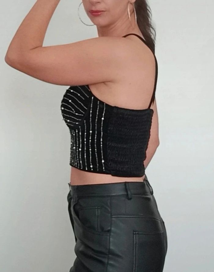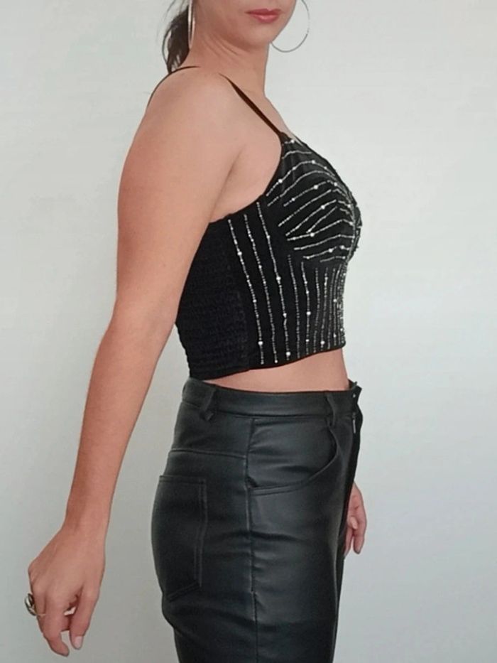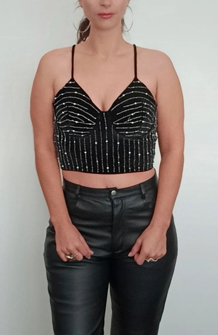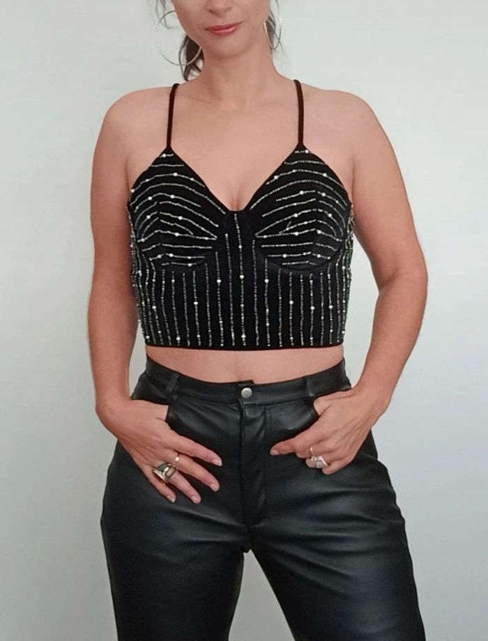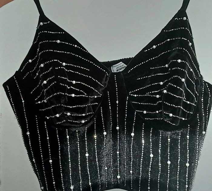 Bustier court en velours noir avec perles blanches, dos smocké, bretelles fines réglables, décolleté féminin, confortable et sexy chic, idéal soirée ou événement #bustier38 #topcrophiver #topcrop38 #topbustier38 #bustiervelours38 #bustiercourt38 #bustierperles #topperles #topsoiree38 #topfetes38 #topreveillon38 #topsexy38
