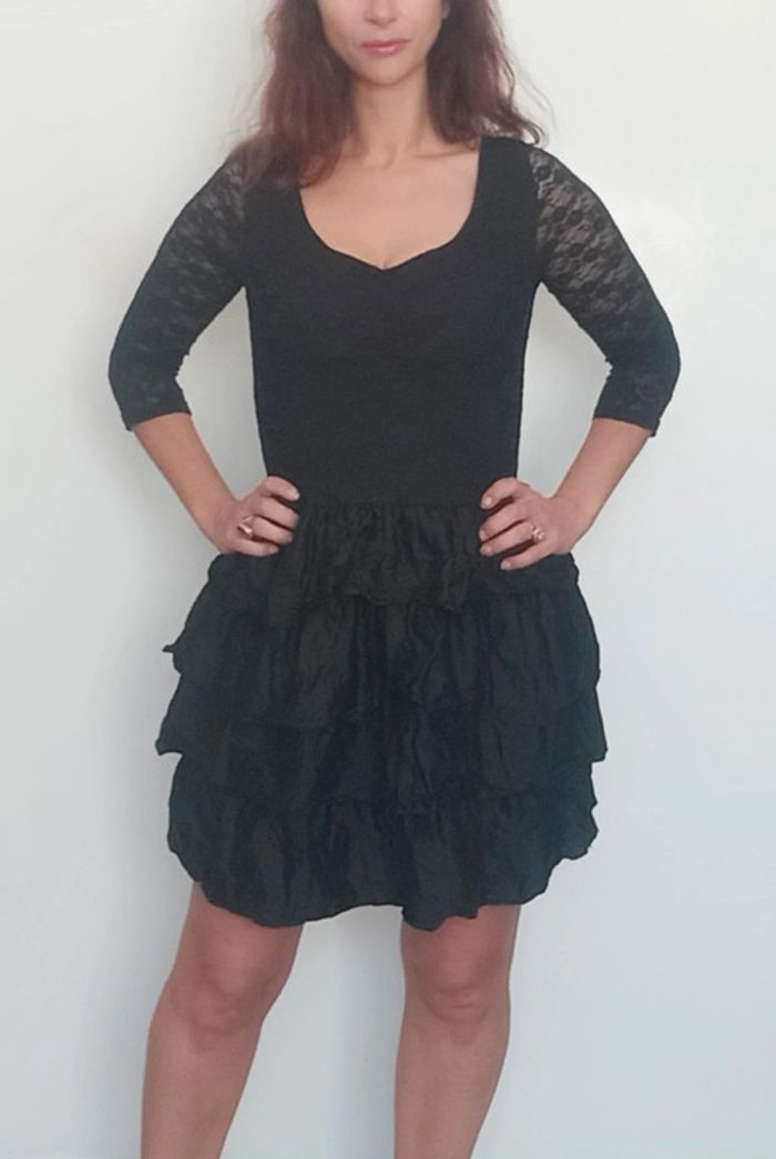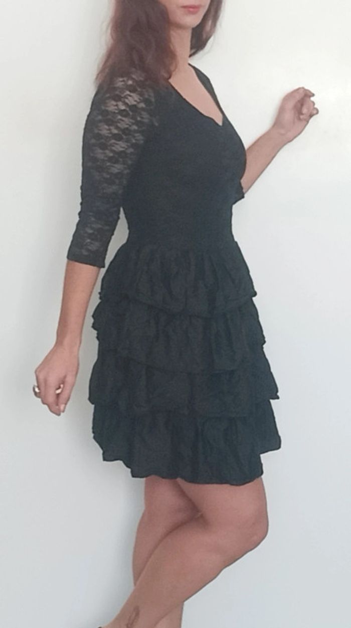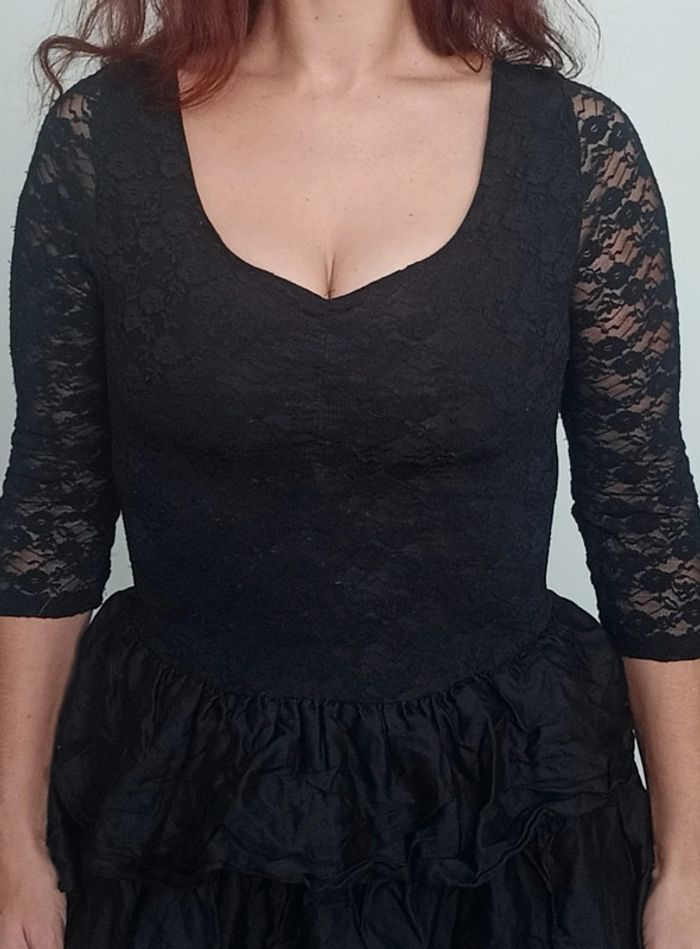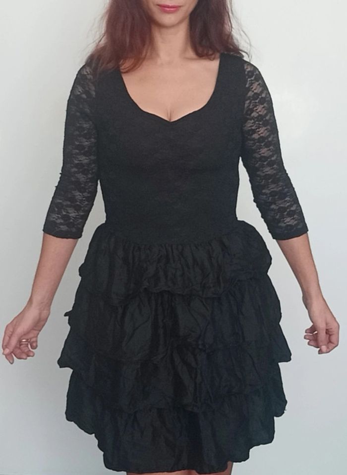 Regardez mes autres articles dans cette taille pour grouper les fdp #poupoupidou38 Petite robe noire haut décolleté coeur manches trois quarts dentelle, extensible, et jupe volantées, seulement bon état car dentelle un peu filée et jupe a repasser 😅 #petiterobenoire38 #robedententelle38 #robevolantee38 #robefetes38 #robedentellenoire38 #robecocktail38