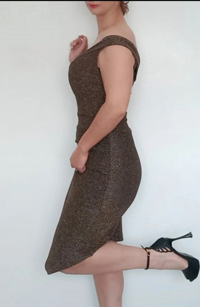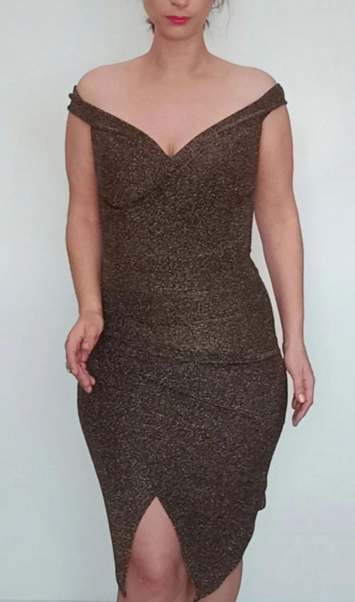 Regardez mes autres articles dans cette taille pour grouper les fdp #poupoupidoutu Robe cocktail ou soirée, toute dorée pailletée, bretelles larges épaules nues, moulante fendu en bas devant, chic et féminine, très brillante idéale #robereveillon #robefetes #robedoree #robepailletee #robeepaulesnues #robechic #robenoel #robesexychic #robebrillante