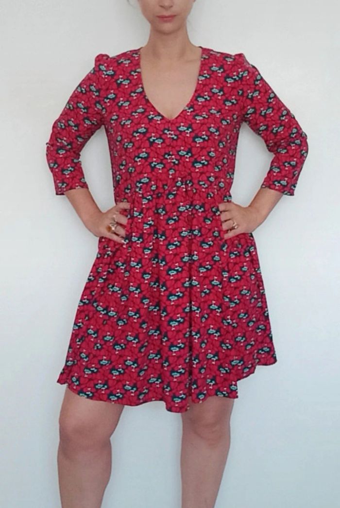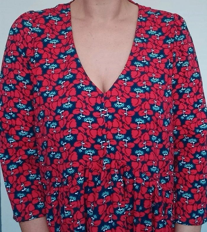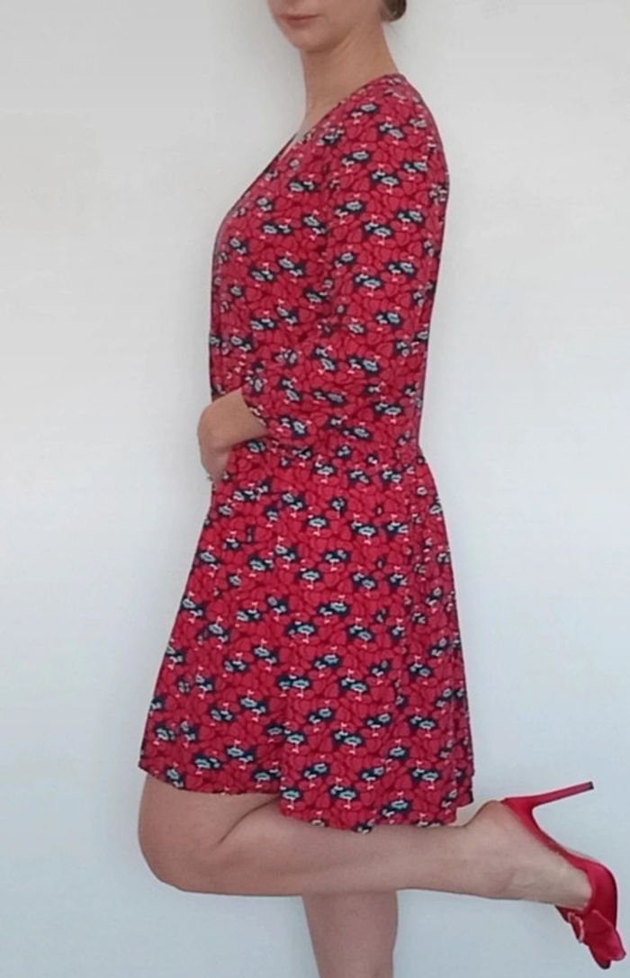 Regardez mes autres articles dans cette taille pour grouper les fdp #poupoupidou40 Belle robe mi longue fleurie, décolleté en V, manches trois quarts, tons rouges et bleu, chic et féminine, confortable #vintagedressing #robe40 #robefleurie40 #robefeminine40 #robefluide40 #robevintagedressing40