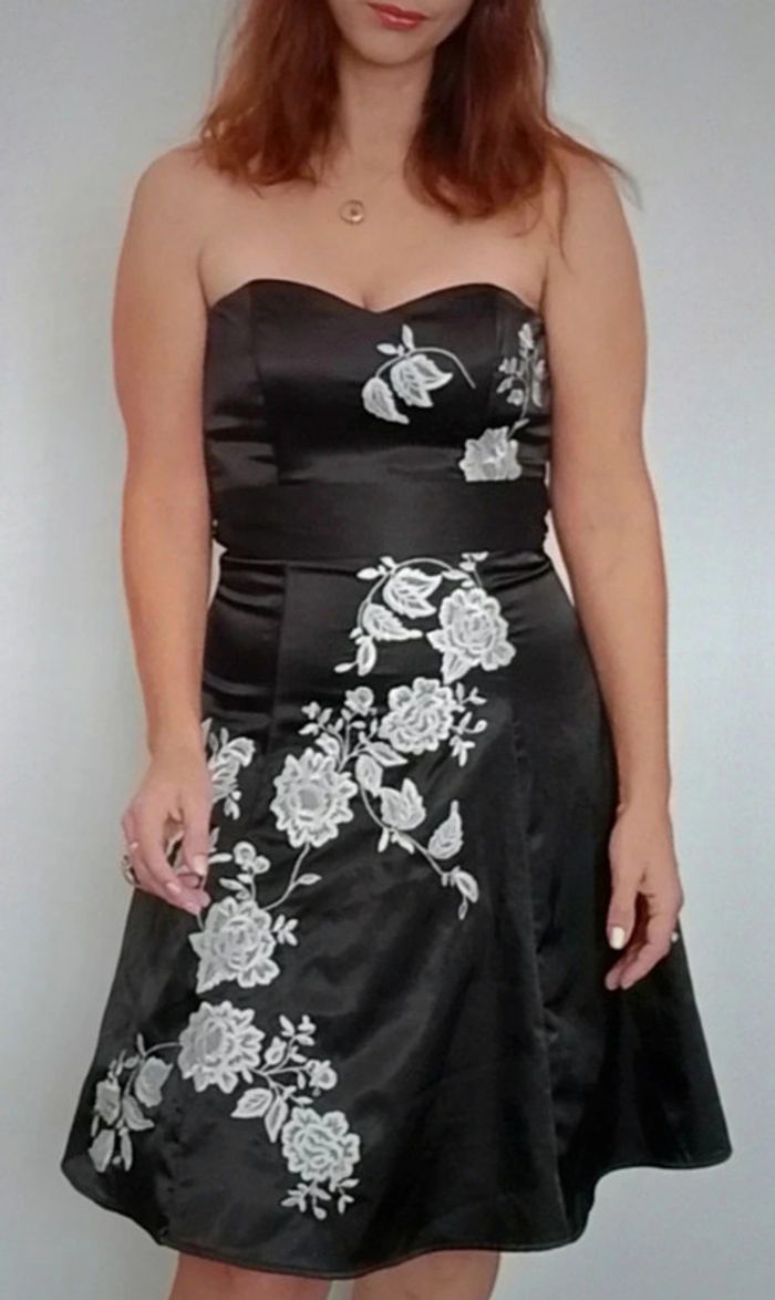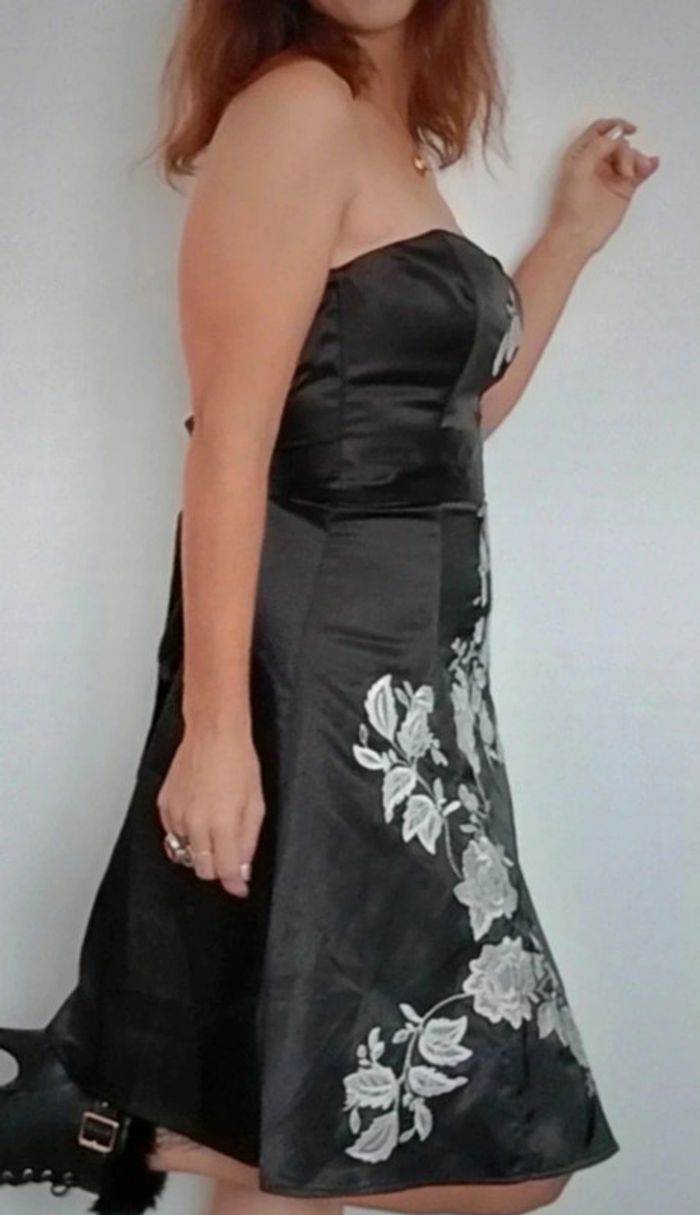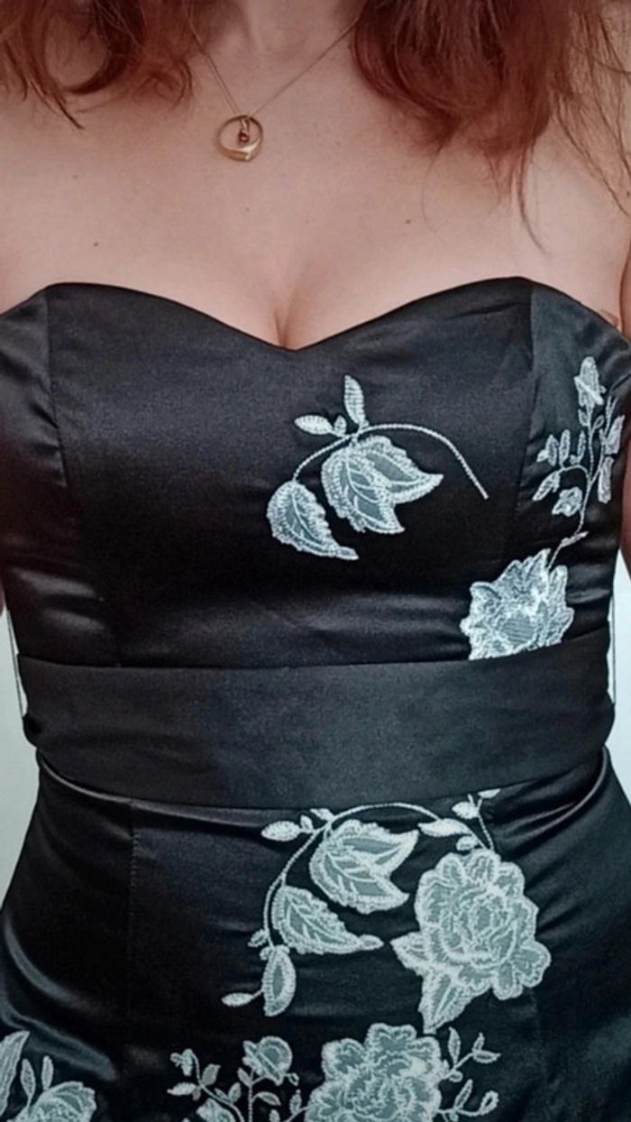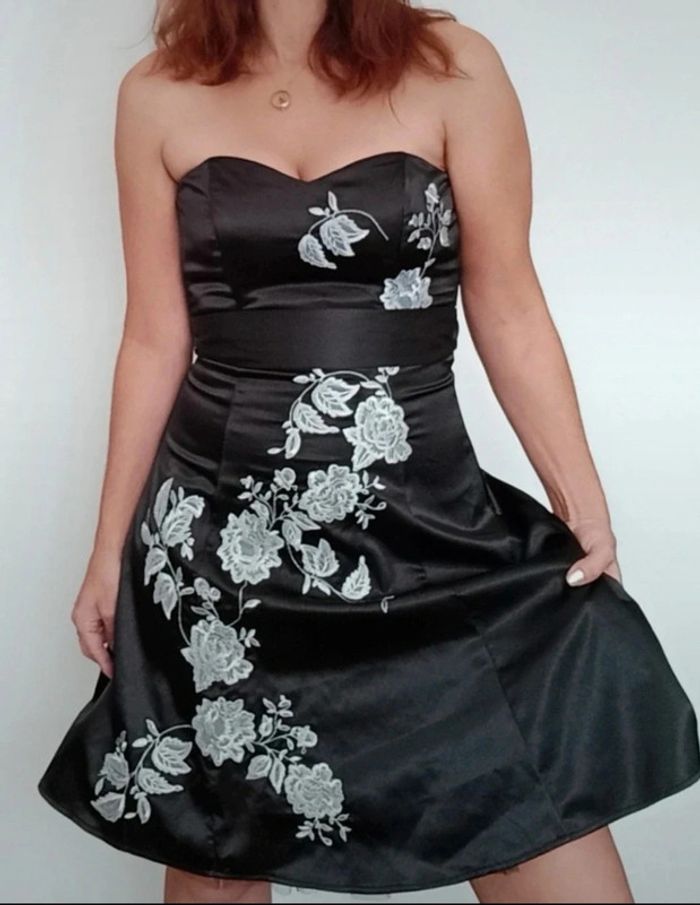 Regardez mes autres articles dans cette taille pour grouper les fdp #poupoupidou34 Robe de soirée bustier satinée très chic, décolleté coeur, doublée, unie noir à fleurs brodées, tulle en bas, liens satin pour cintrer la taille, mi longue jupe évasée, très belle qualité, beaucoup d effet, fermeture éclair dos, hélas trop petite pour moi #robecocktail34 #robefetes34 #robereveillon34 #robesoiree34 #robebustiersatin34 #robexanaka34 #robesatin34 #robebroderies34 #robeevenement34