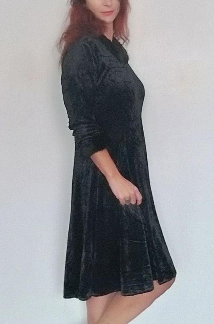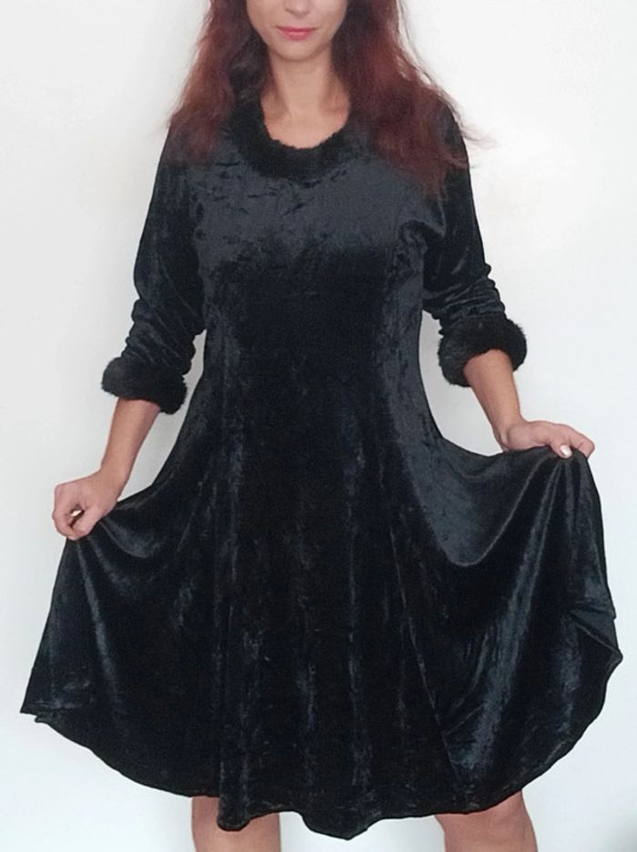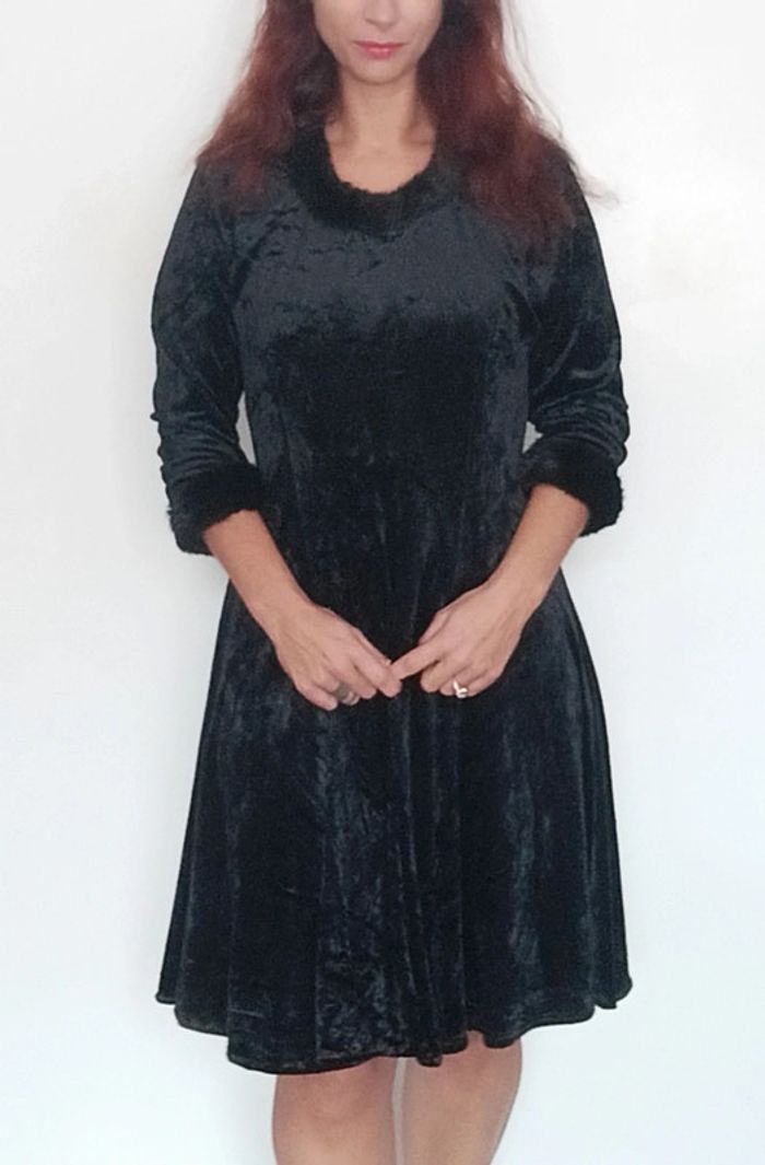 Regardez mes autres articles dans votre taille pour grouper les fdp #poupoupidou40 #poupoupidouxl Robe vintage en velours noir, mi longue jupe évasée, haut manches trois quarts bordures fourrure noire, col rond aussi orné de fourrure noire, belle qualité, a cintrer avec une ceinture ou a laisser fluide, douche, chaude, confortable et féminine, idéale occasion, taille 40/42 #robenoel42 #robenoelxl #robefetes4042 #robefetesxl #robevelours4042 #pepitevintage #robeglamour40 #robeglamour42 #robesoireevintage