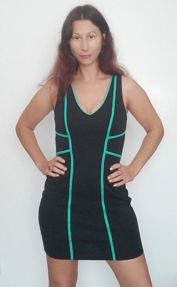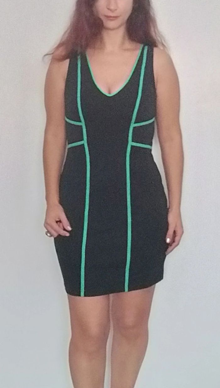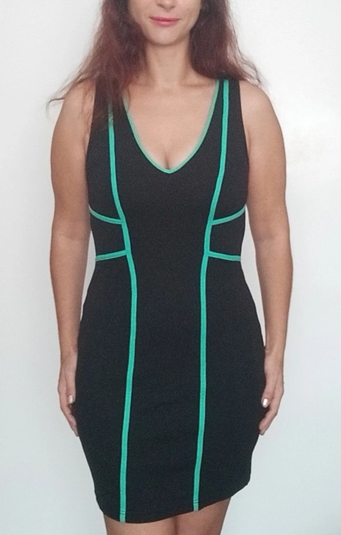 Regardez mes autres articles dans votre taille pour grouper les fdp #poupoupidou40 Robe moulante matière de qualité, extensible, noire avec liserés turquoise / menthe, décolleté féminin en v, chic et sexy #robe40 #robemoulante40 #robechic40 #robepinup40 #robesexy40 #robesoiree40 #robebandage40 #robeelegante40 #robesexychic40 #robeteveillon40