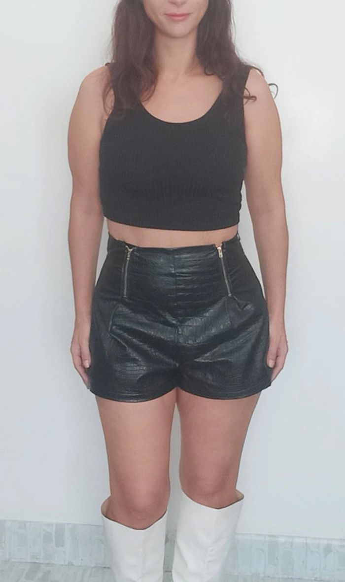 Short taille haute uni noir, similicuir épais texturé façon crocodile, cintre a la taille, à pinces, et fluide aux cuisses, court, sexy #shortcuir38 #shortsimilicuir38 #shortcroco38 #shortsexy38 #shortcourt38 #shorttaillehaute38 #short38 #shorthiver38