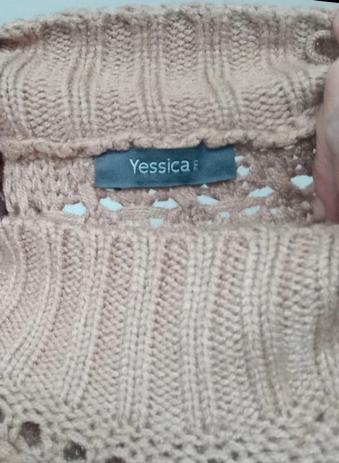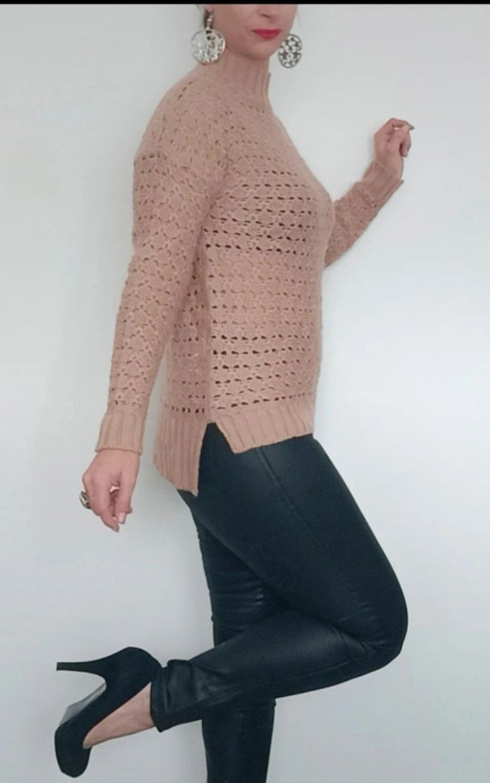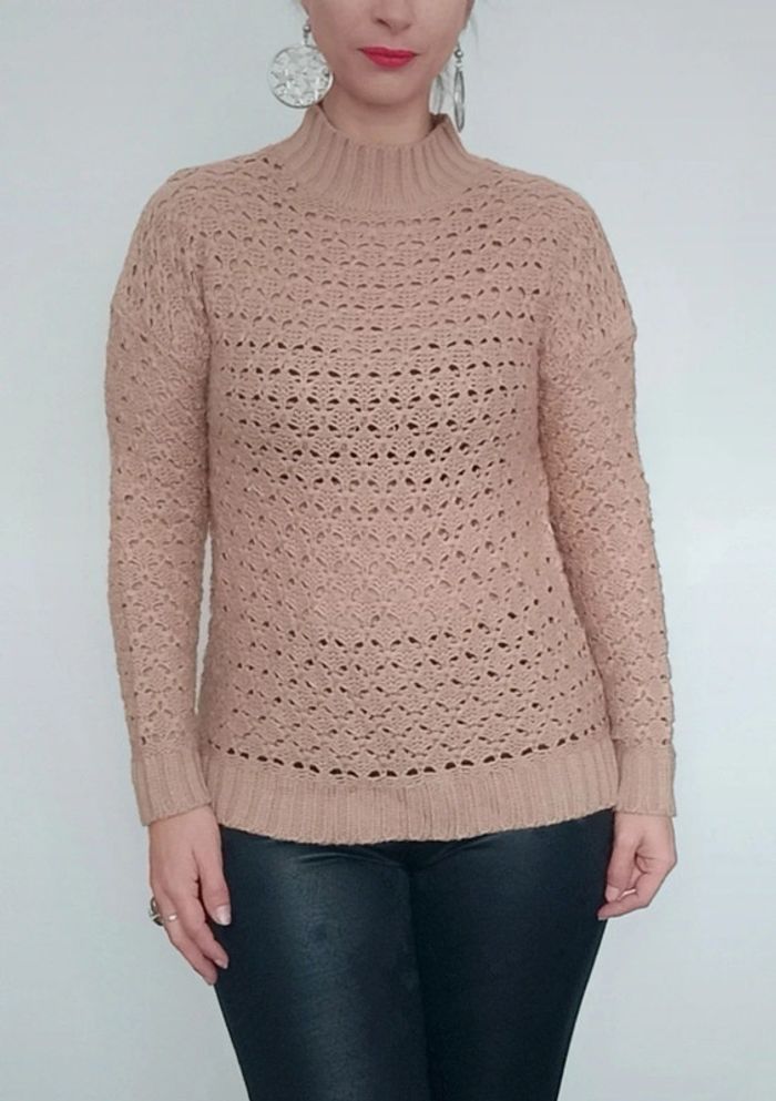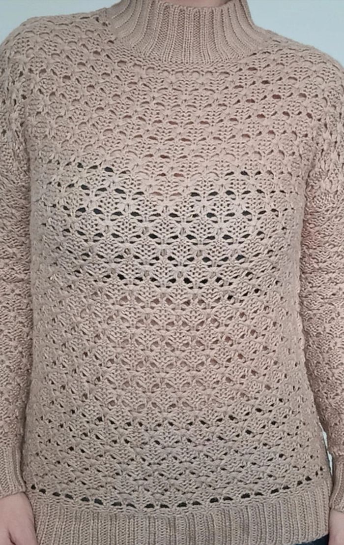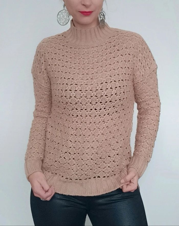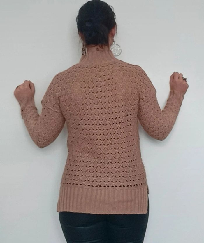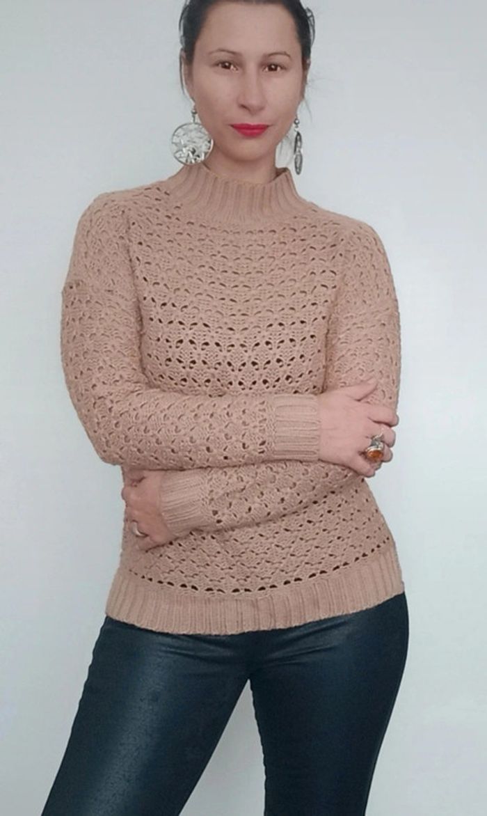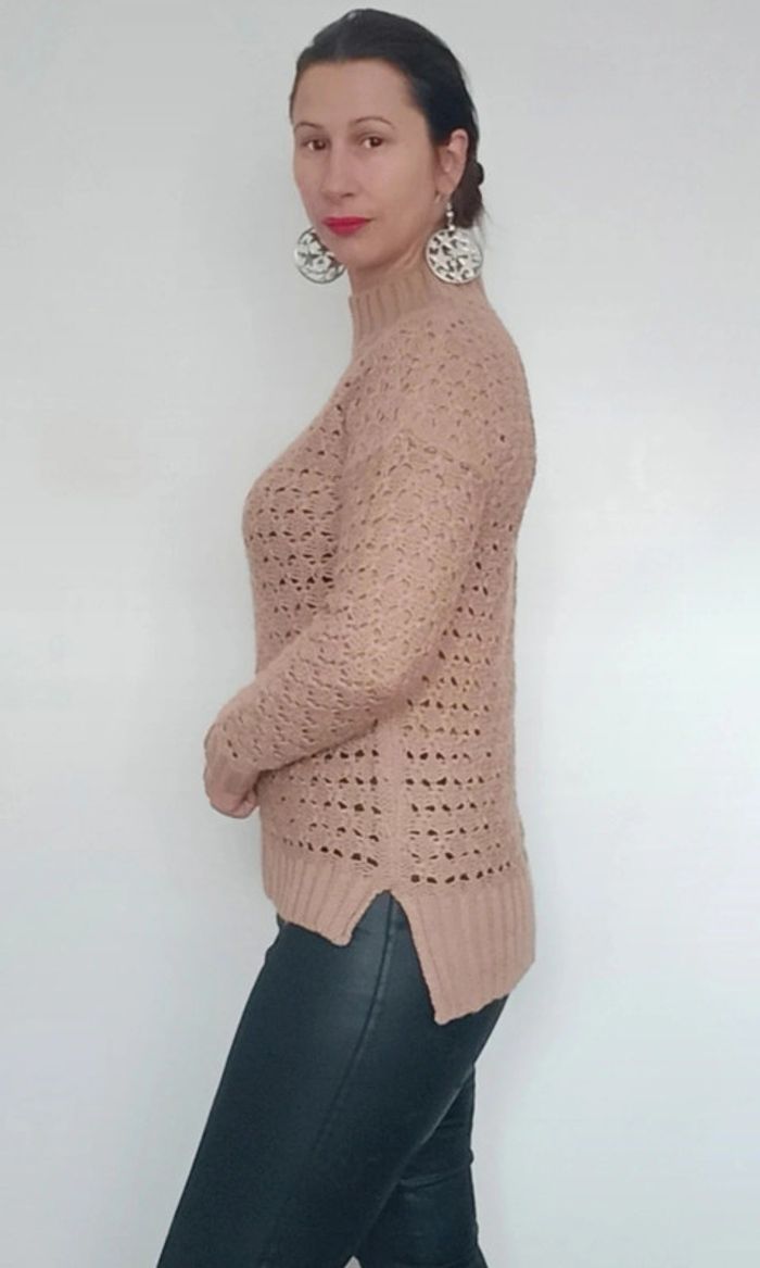 Pull crochet uni marron clair, a grosses mailles, ajouré, col montant et légèrement asymétrique plus long derrière, fendu côté, féminin et facile a assortir, taille 38/40 #pullcrochet38 #pullcrochet3840 #pullajoure #pullcrochet40 #pull3840 #pull38 #pull40