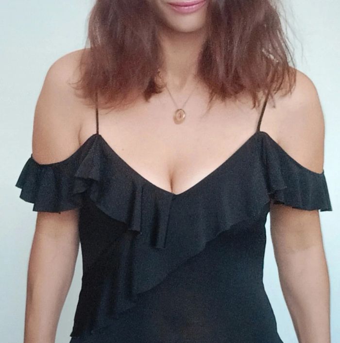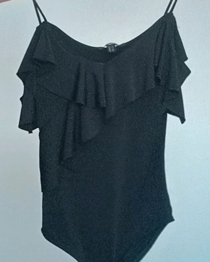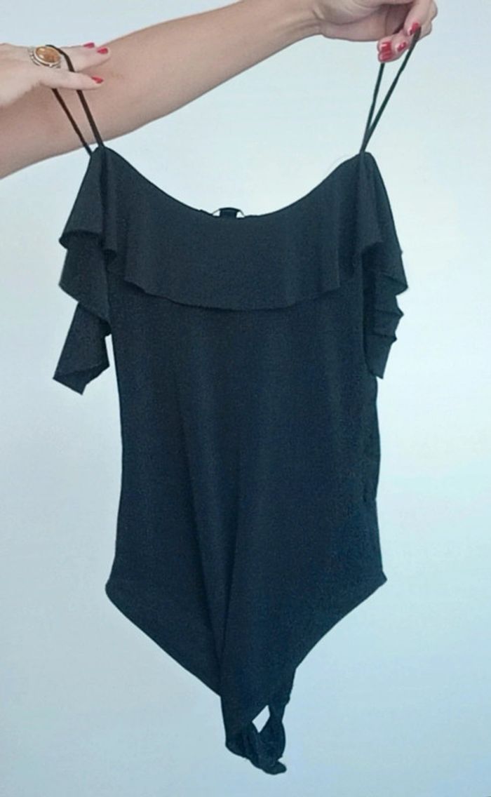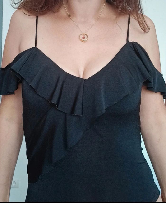 Body haut volanté et décolleté, forme cache-cœur, épaules nues et fines bretelles, taille XS , uni noir, pratique et féminin #bodyxs #body34 #bodyepaulesdecouvertes34 #bodyepaulesnues34 #bodynoir34 #bodynoirxs #bodydecollete34 #bodysexy34
