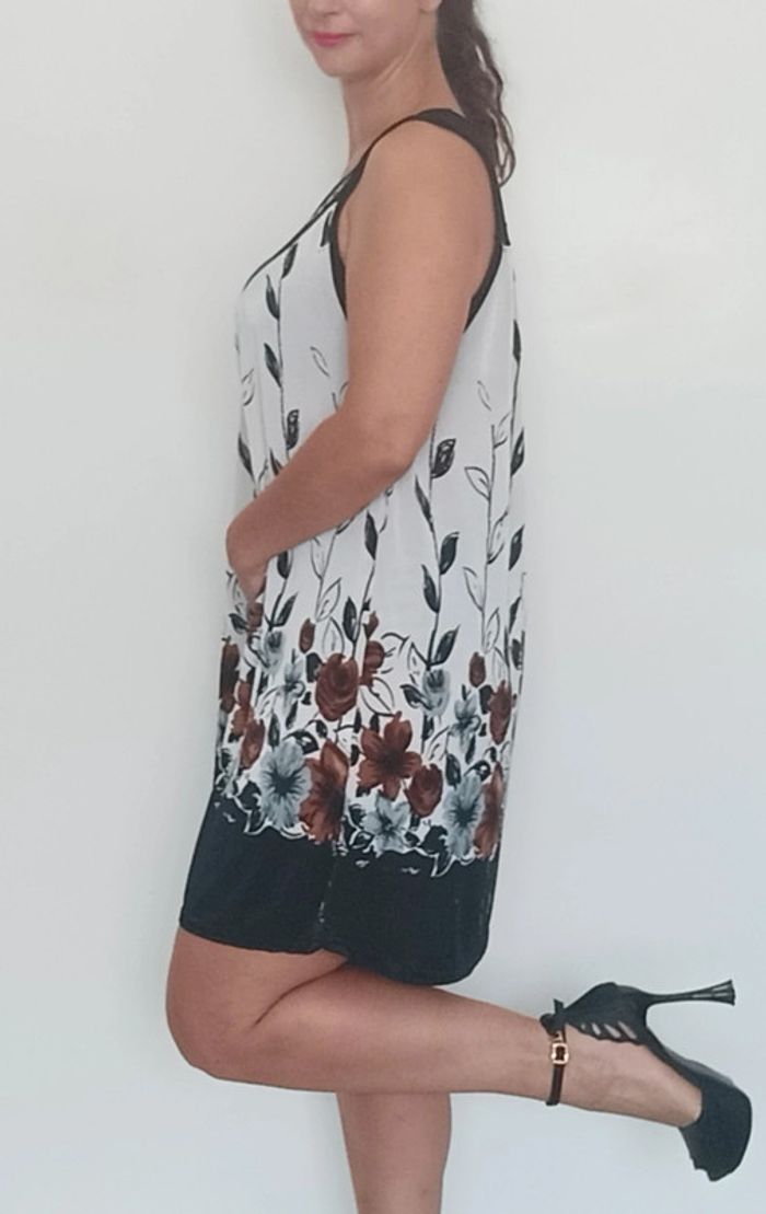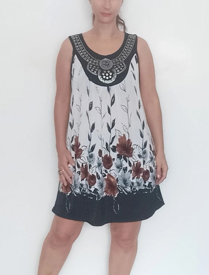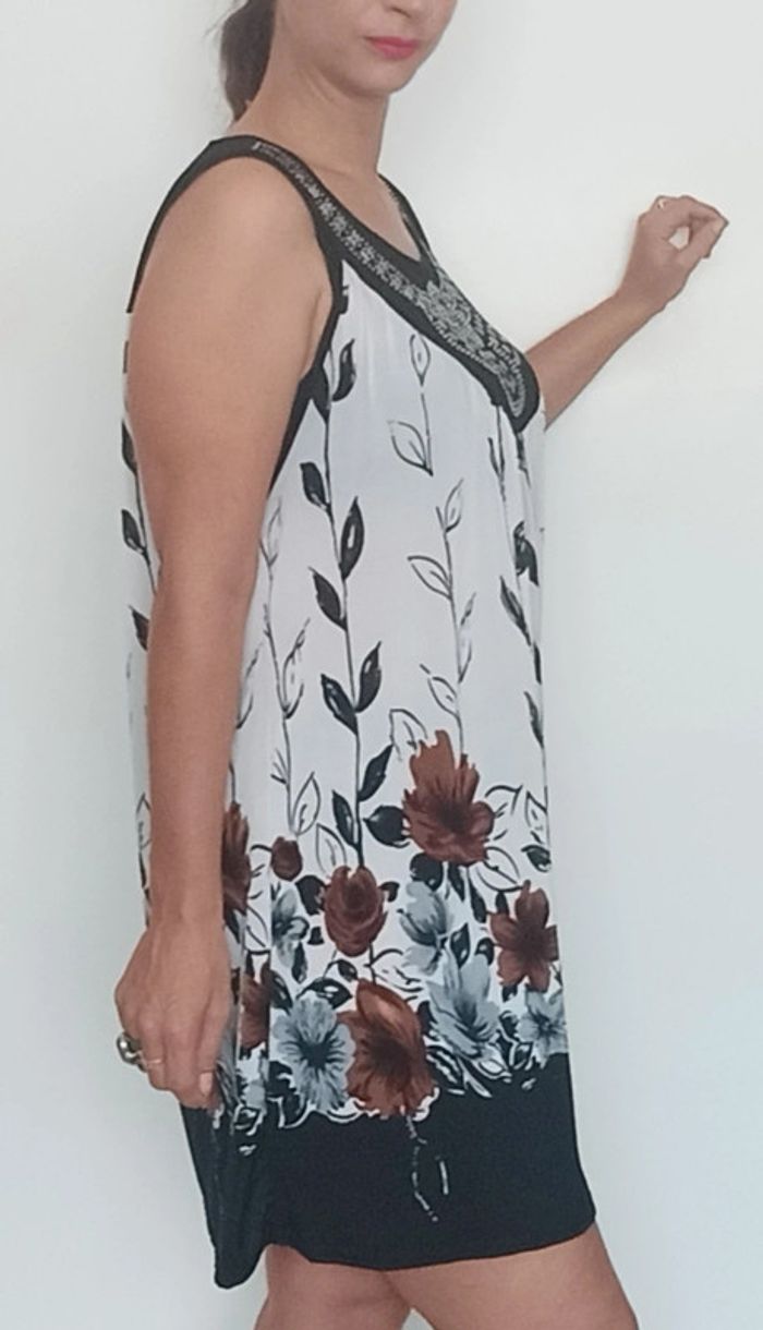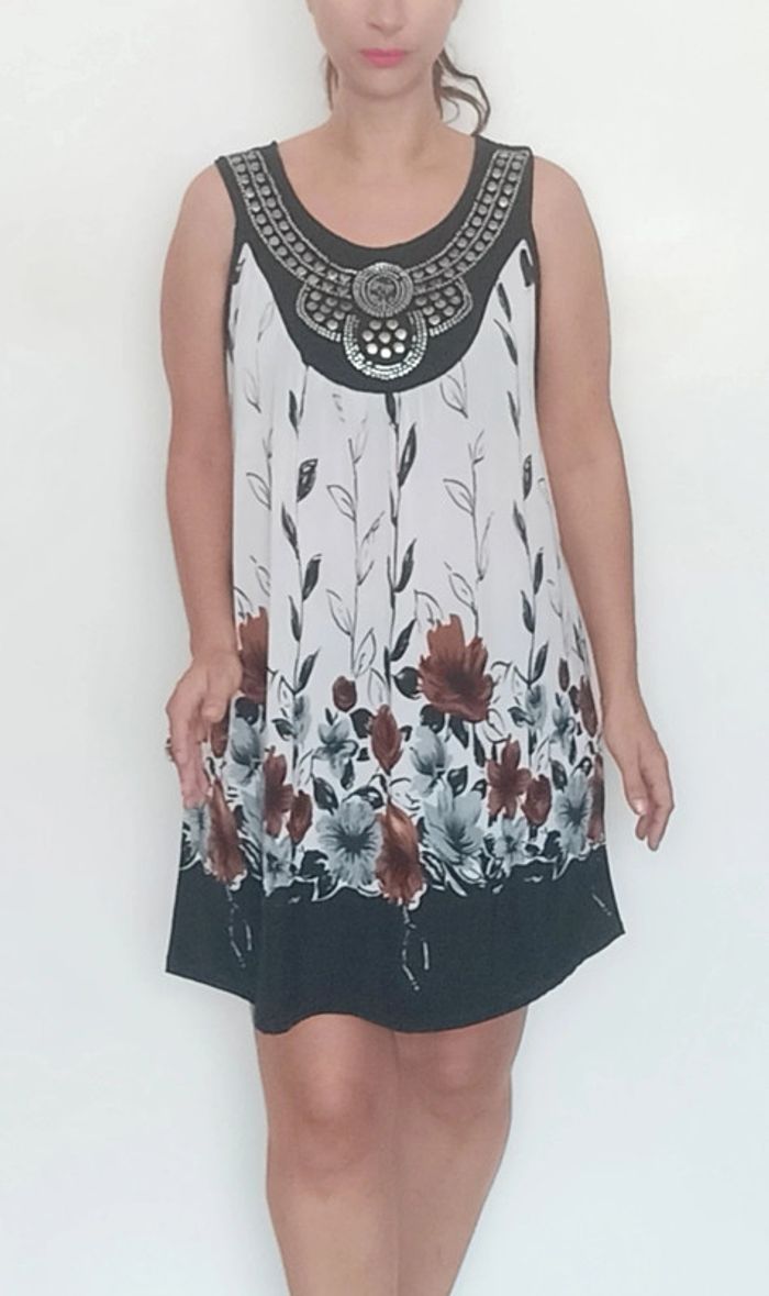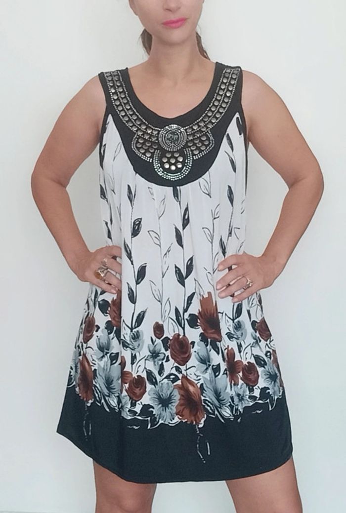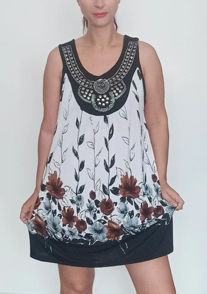 📣 regardez mes autres articles dans votre taille à #poupoupidoutu pour économiser sur les frais de ports et bénéficier d'une réduction 😊🌸 -10% pour deux articles achetés -20% pour trois et + Faites moi l'offre ( pas encore automatique) 🫶🫶🫶🫶🫶🫶🫶 Robe courte fluide et légère, sans manches, avec plastron clouté style ethnique au col, motif fleuri, bien ample, taille unique du 38/40 aux grandes tailles #robefluide #robelegere #robeethnique #robeample #robetunique #robefluidegrandetaille #robegrandetaille #robecourte #robefleurie