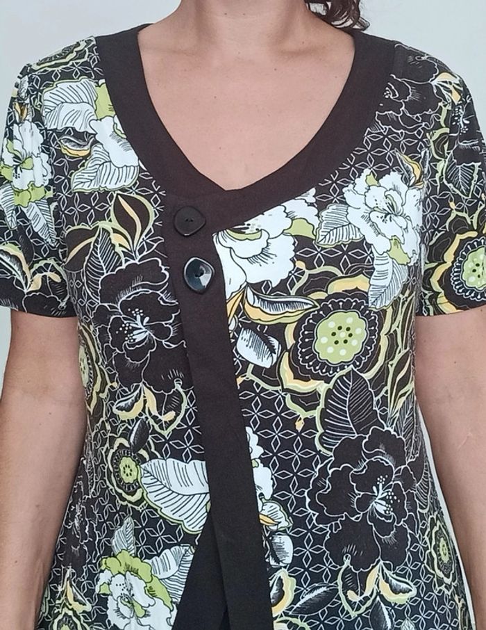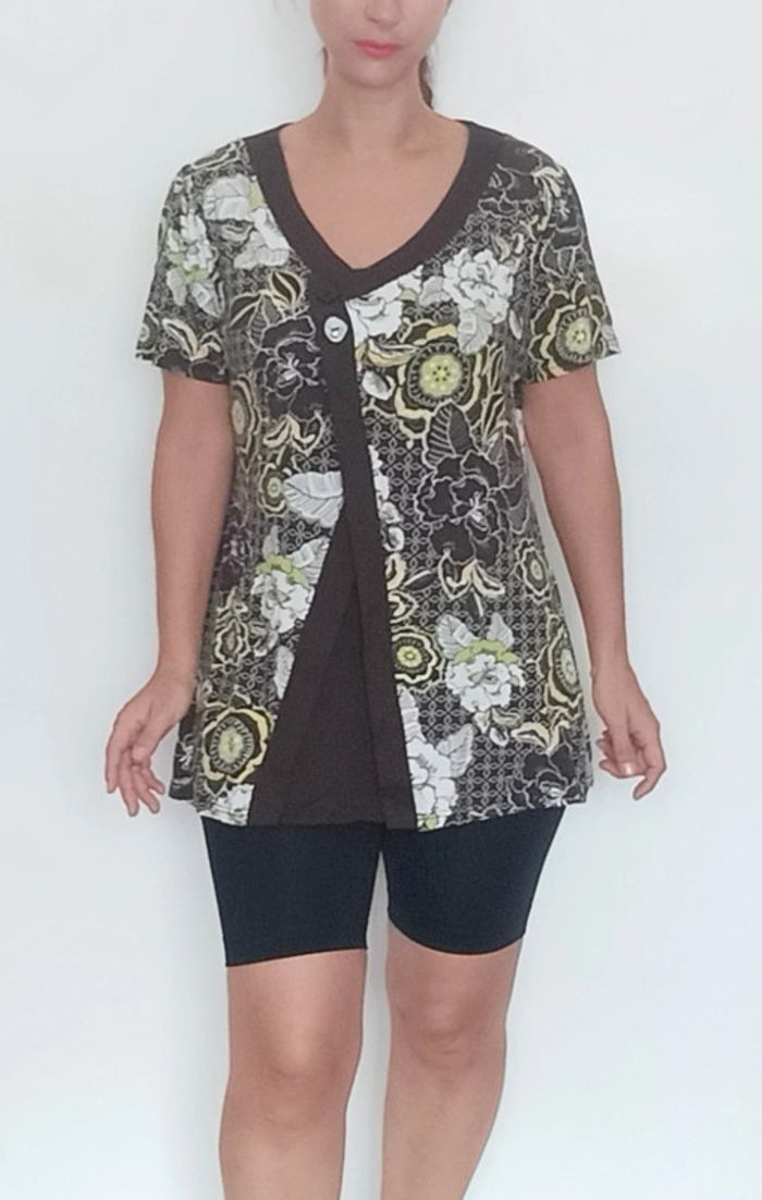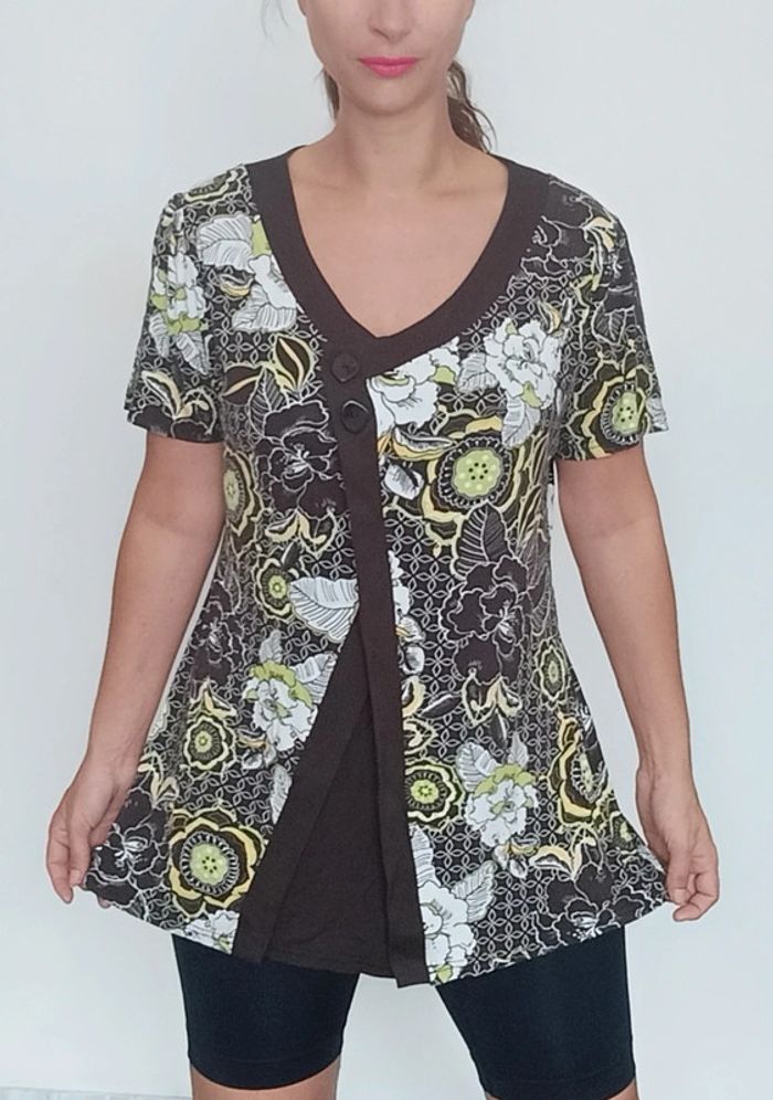 📣 regardez mes autres articles dans votre taille à #poupoupidou44 pour économiser sur les frais de ports et bénéficier d'une réduction 😊🌸 -10% pour deux articles achetés -20% pour trois et + Faites moi l'offre ( pas encore automatique) 🫶🫶🫶🫶🫶🫶🫶 Haut long casual confortable, manches courtes, en deux pans, avec deux boutons au buste, forme évasée pour le pan supérieur, style ethnique, tons marrons et verts, taille xxl #haut44 #hautethnique44 #hautcasual44 #hautlong44 #hautfleuri44 #hautethniquexxl