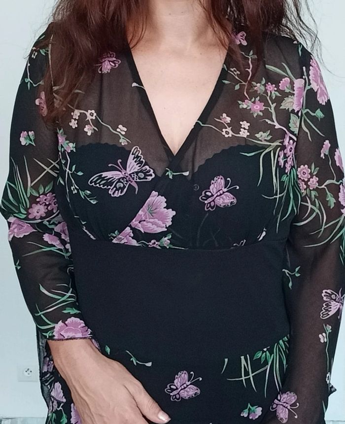 📣 Pour un lot, me contacter 😊🌸 -10% pour deux articles achetés -20% pour trois et + 🥰 #poupoupidou38 🫶🫶🫶🫶🫶🫶🫶 Robe mi longue chic et féminine, haut coeur croisé décolleté en V en voile, transparent, bande noire large et cintrée à la taille pour la marquer, jupe mi longue fluide doublée, manches longues évasées voiles beaucoup d effet #robechic38 #robenoirefleurie38 #robefleurie38 #robemilongue38 #robeasie38 #robemanchesevasees #robeelegante38 #robefeminine38 #robeceremonie38 #robesoiree38