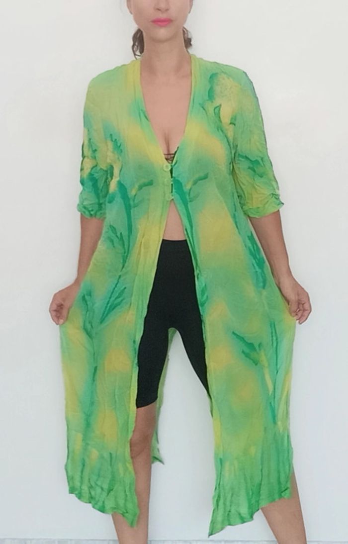 📣 regardez mes autres articles dans votre taille à #poupoupidoutu pour économiser sur les frais de ports et bénéficier d'une réduction 😊🌸 -10% pour deux articles achetés -20% pour trois et + Faites moi l'offre ( pas encore automatique) 🫶🫶🫶🫶🫶🫶🫶 Chemise longue légère motif tropical, ferme par trois boutons au buste, fendue, tons verts menthes, manches trois quarts, très sympa, colorée et originale, a porter en veste ou sur maillot de bain, made in France, 100% viscose, plutôt à partir du 40 😉 #vestelongue #chemiselongue #vestechemise #giletlong #vestetropicale #chemisemaxi #vestemaxi #vesteete #chemisetunique #vestelegere