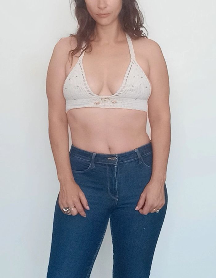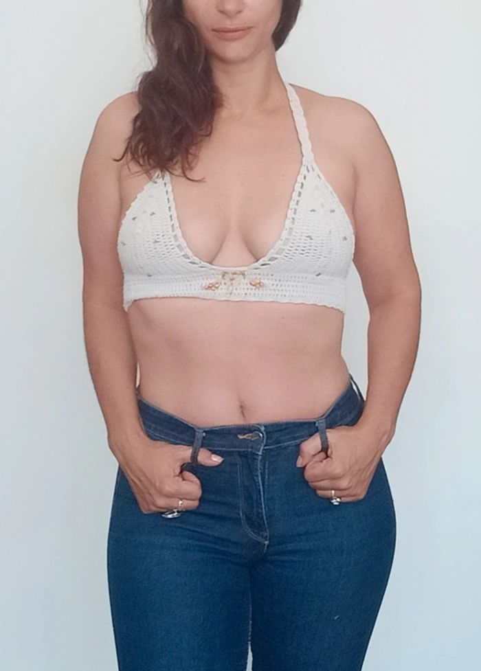 📣 Pour un lot, me contacter 😊🌸 -10% pour deux articles achetés -20% pour trois et + 🥰 #poupoupidoutu 🫶🫶🫶🫶🫶🫶🫶 Top court façon brassière, à nouer dans le cou et dans le dos, en crochet blanc, ajouré le long du décolleté, style ethnique avec petits bijoux, perles, fleur. Un peu petit pour mon bonnet C, convient jusqu au 95 en tour de poitrine #brassierecrochet #topcrop #topcropcrochet #hautete #topmini #topcrochet #topanouer #brassiere #brassiereete #topvacance #topcourtcrochet