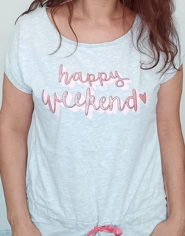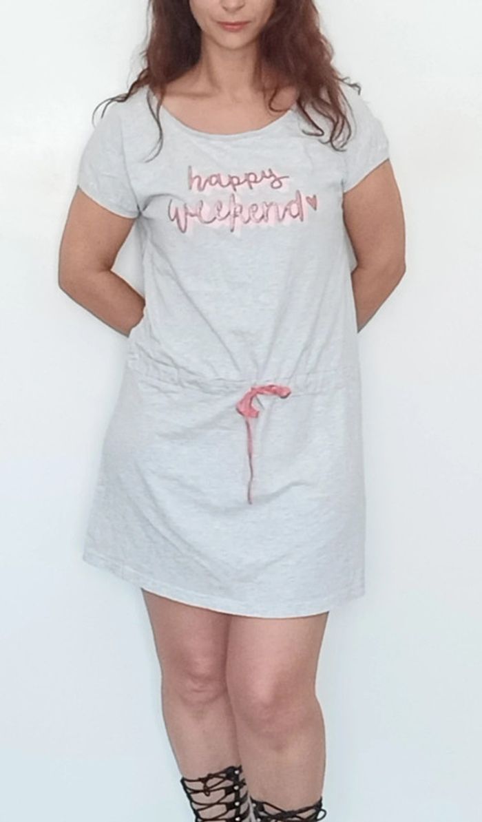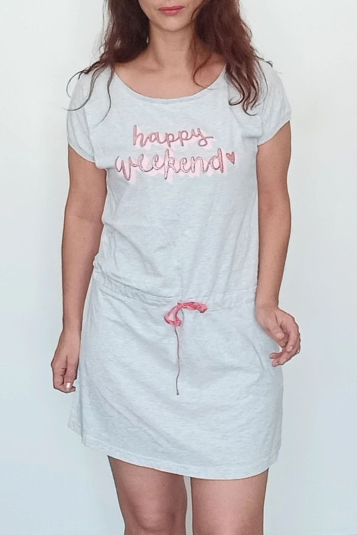 📣 Pour un lot, me contacter 😊🌸 -10% pour deux articles achetés -20% pour trois et + 🥰 #poupoupidou40 🫶🫶🫶🫶🫶🫶🫶 Robe d intérieur casual, confortable en coton, façon t-shirt a blouser grâce au cordon a la taille, facile a porter, fluide, courte, texte "happy weekend" #robedinterieur40 #robecasual40 #robetshirt40 #robeconfort40 #robeinterieur40 #tenueintérieure #nuisette40 #nuisettecoton40 #chemisedenuit40 #robeablouser