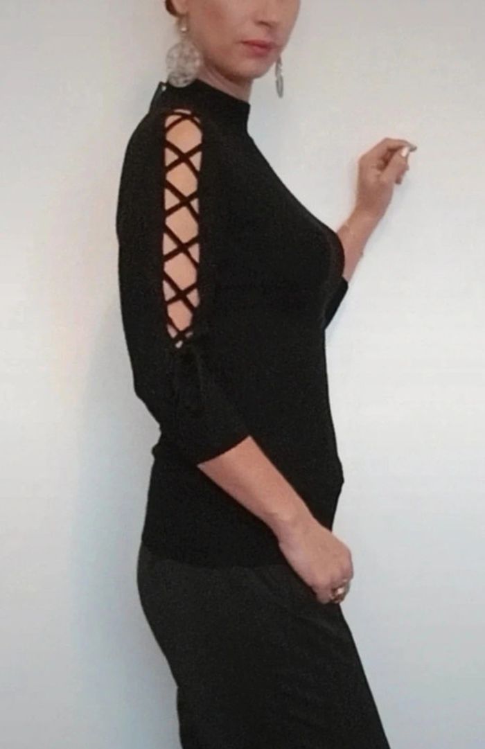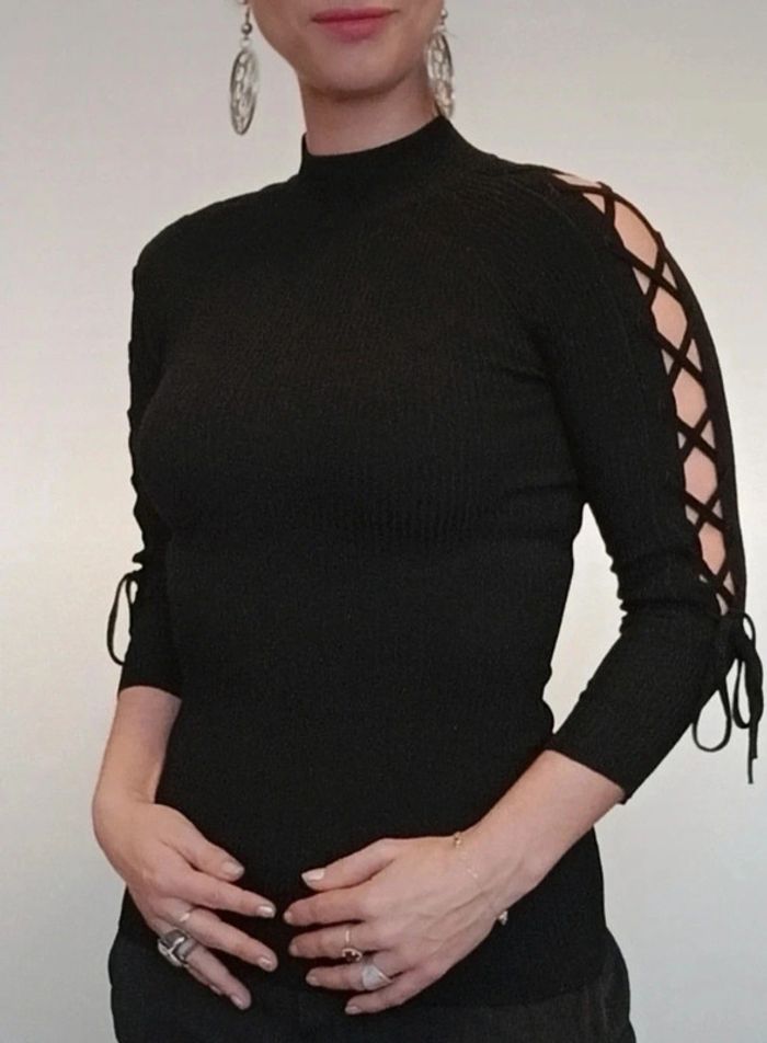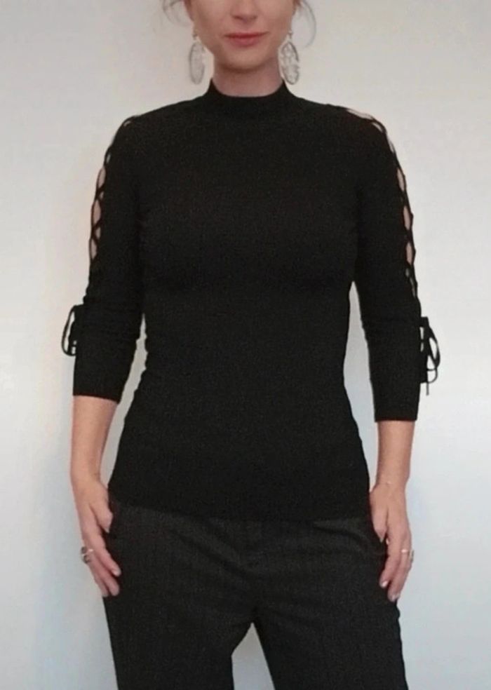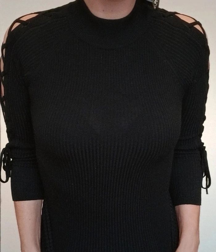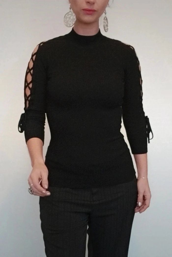 Pull moulant noir manches lacées ajourées 36
