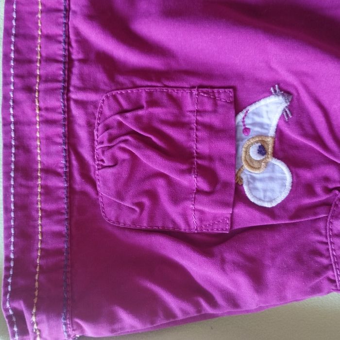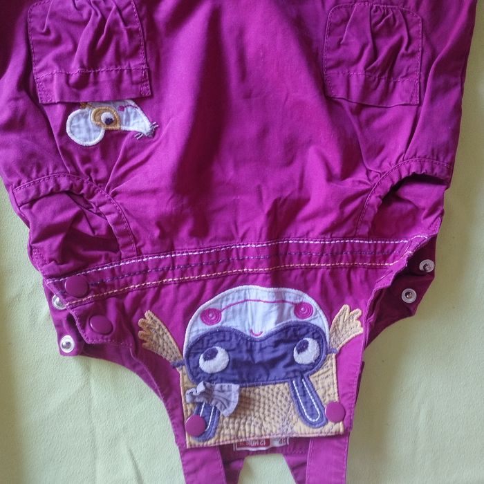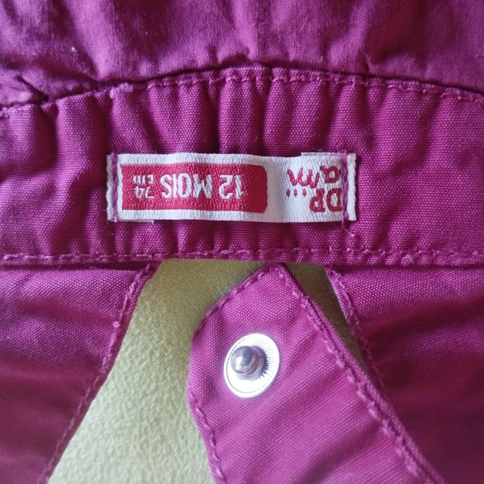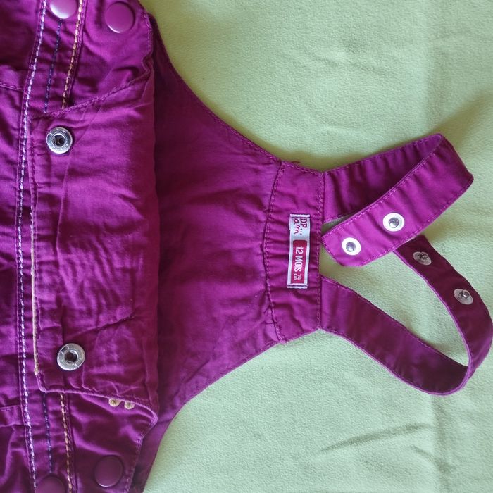 Robe forme salopette pour bébé fille de 1an de Du Pareil Au Même. Bretelles et côtés de la robe par boutons pressions, poches avant, robe doublée. 100%coton. Couleur Framboise