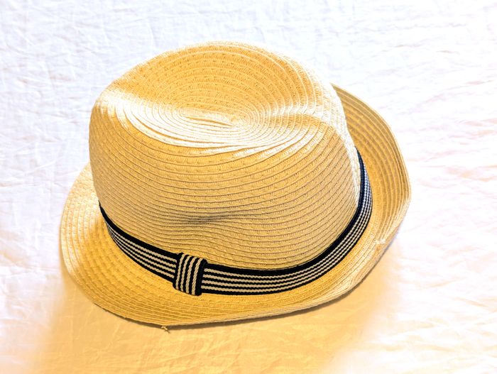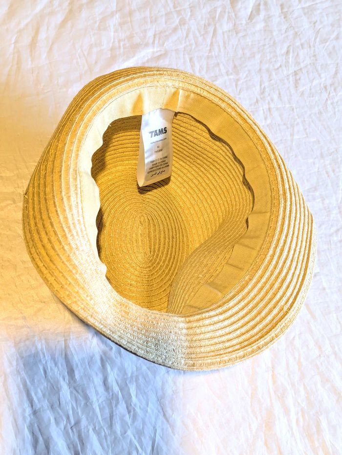 Chapeau "Tams" Crème avec un Large Bandeau Constitué de Fines Rayures Horizontales Blanches et Noires. Accessoire pour les Petits Enfants. ☑ Chapeau "Tams". ☑ "Large" Bandeau. ☑ Bandeau "Rayures". ☑ "Fines" Rayures. Spécifications: Matière: 100% Papier Dimensions du Chapeau: Env. 26 x 23 x 12 cm Taille du Chapeau: 53 Couleur Dominante: Crème Couleurs du Large Bandeau: Blanc - Noir Réf: ve45
