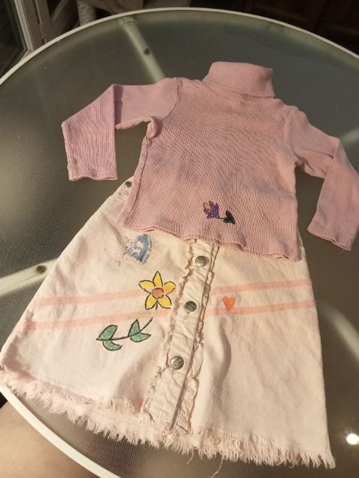 Bon état général 2 pièces Un sous pull 4 ans/ Okaïdi Une jupe 4 ans Le sous pull était tâché ainsi que la jupe que j'ai customiser moi mm et le dessin de la jupe et usé photo si joint