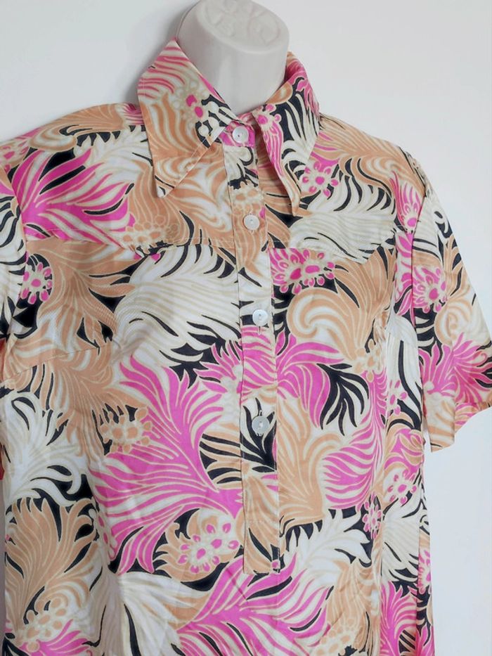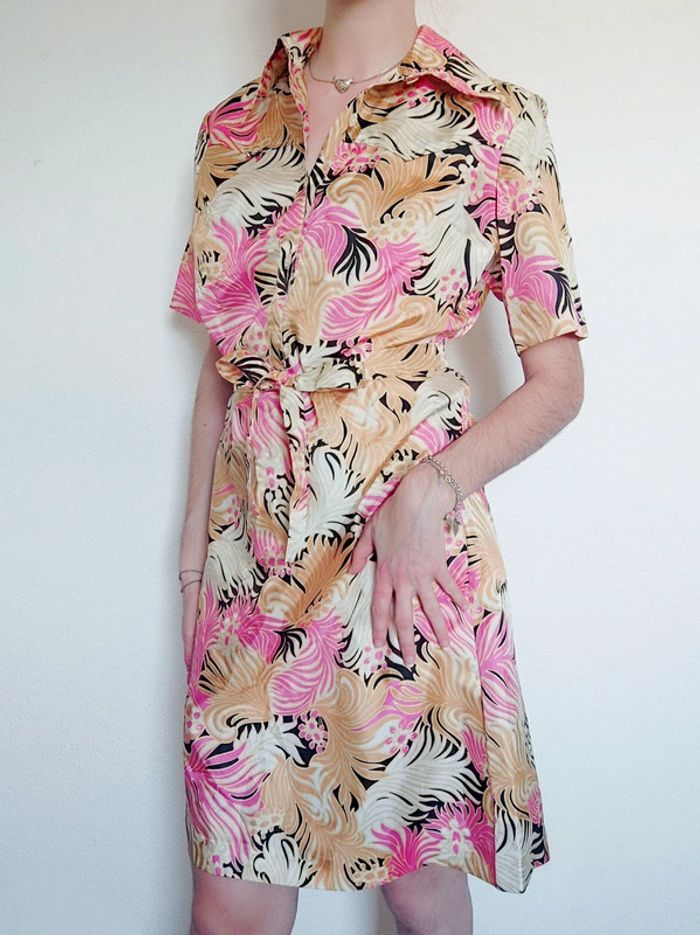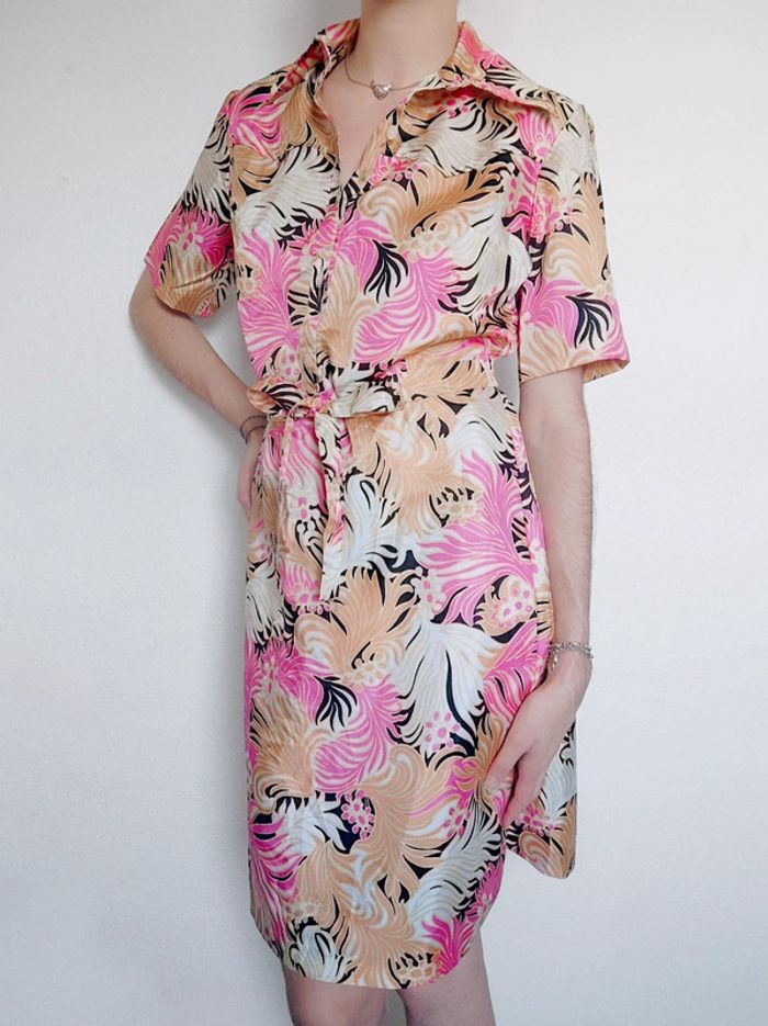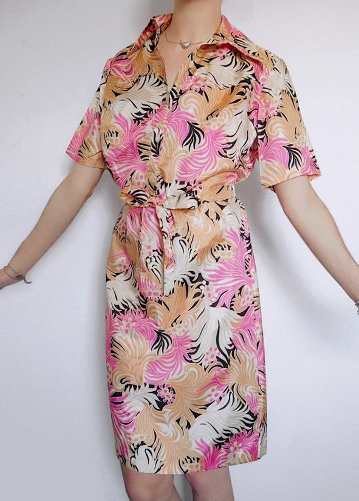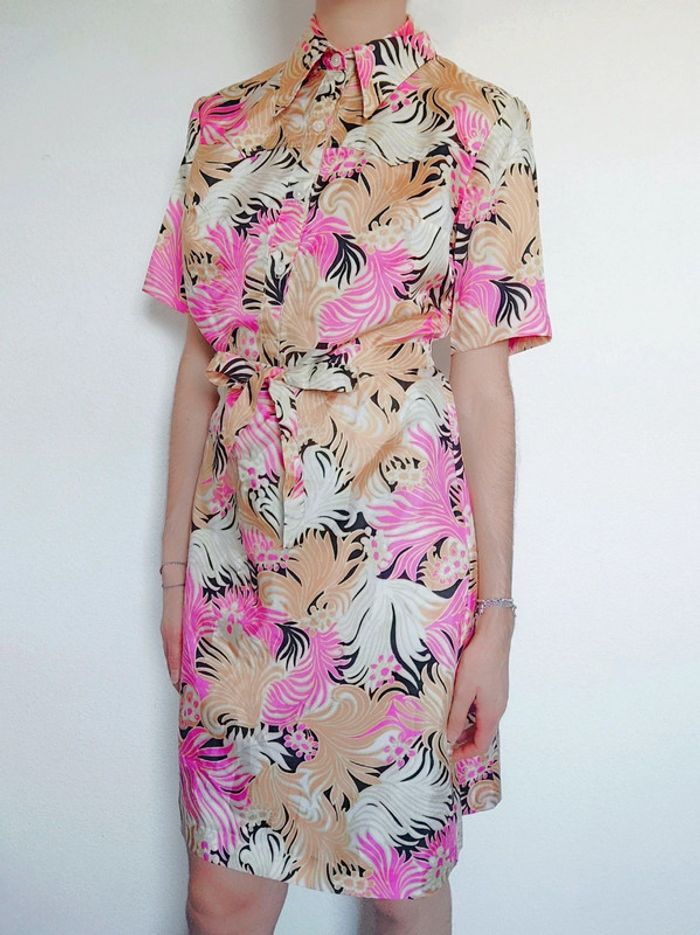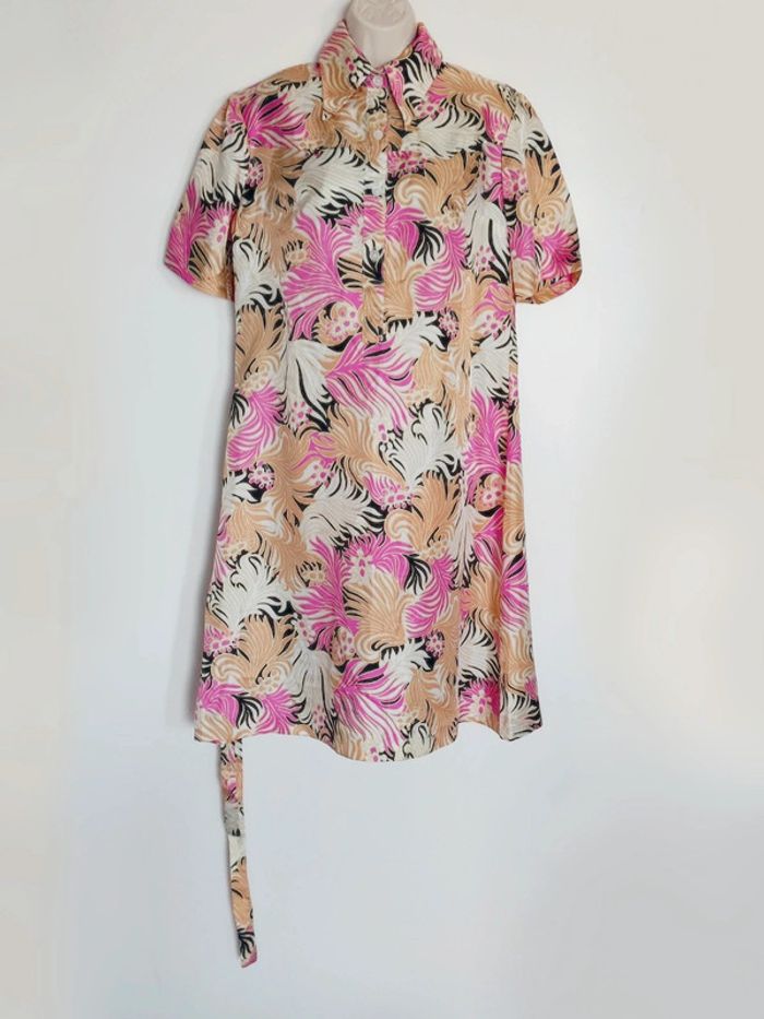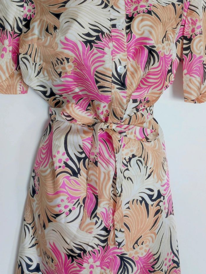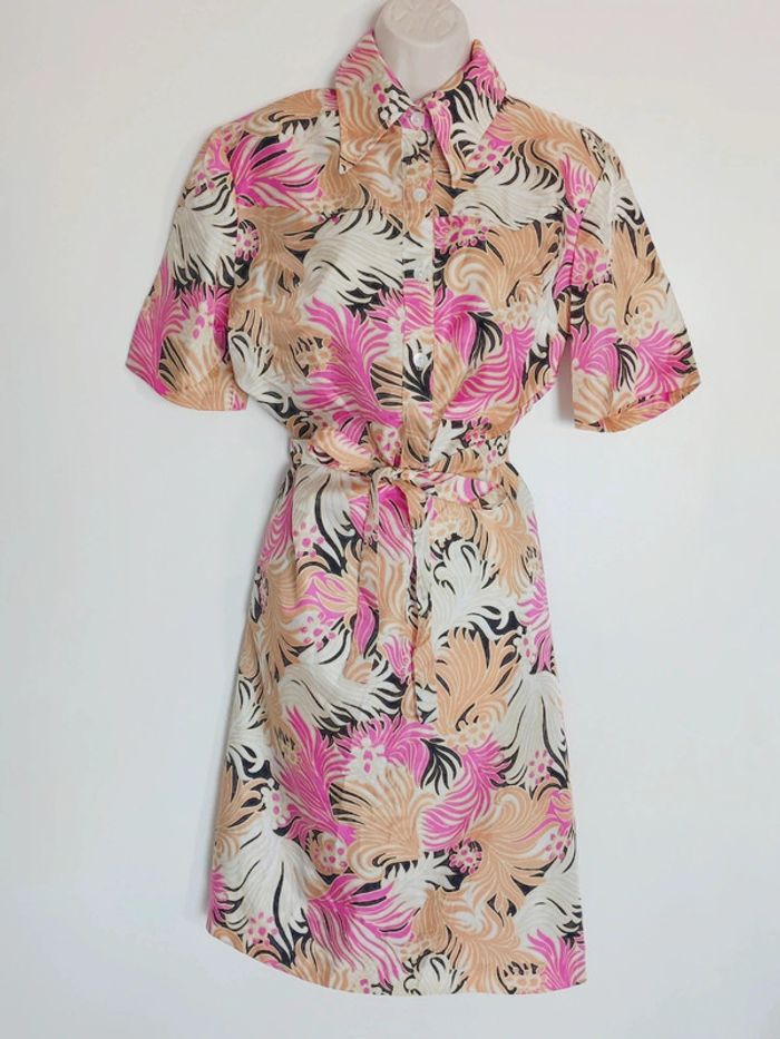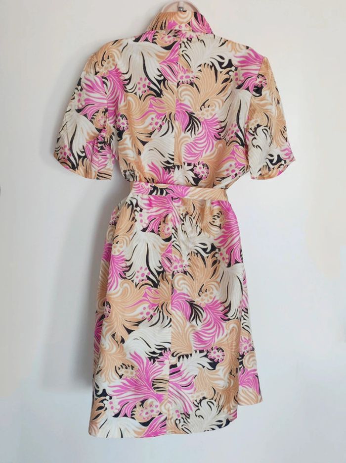 shirt dress, belt, short sleeve,floral feather pattern, ivory fuchsia orange