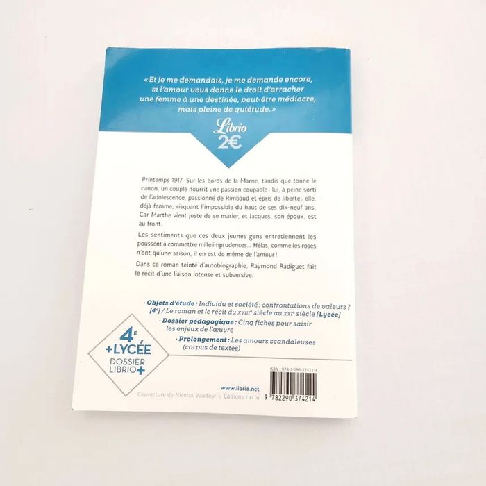 Je vends le roman Le Diable au Corps de Raymond Radiguet ! 🌸 🌟 Caractéristiques : - Titre : Le Diable au Corps - Éditeur : Librio (Livre du programme de 4ème (Collège) + Première (1e) - Lycée (Bac de français)) - Genre : Psychologique, Romance, Autofiction - État : Bon état - Quelques passages sont surlignés - Synopsis : "Un adolescent de 16 ans rencontre Marthe, une jeune femme dont le mari est parti à la guerre. Ils vivent une relation passionnelle et secrète, malgré la différence d’âge. Marthe tombe enceinte. Le narrateur, immature, continue à mener sa vie sans se soucier des conséquences. La guerre reste en arrière-plan, mais la société juge leur relation. À la fin, Marthe meurt en couches, et le narrateur reste seul, marqué par cette histoire." D'autres romans sont en vente sur mon compte ! Voici des tags pour vous aider à explorer mon dressing : #miyako_roman #miyako_livre #miyako_lediableaucorps #miyako_romance #miyako_psychologique #miyako_autofiction #miyako_librio 🪷 📍Je privilégie Mondial Relay, car le point relais est à côté de chez moi. Les autres modes d’envoi sont désactivés. Cependant, si vous n’avez pas de Mondial Relay proche de chez vous, n’hésitez pas à me contacter, et je ferai de mon mieux pour trouver une solution d’expédition. Si vous avez besoin de renseignements supplémentaires, n'hésitez pas ! 😊 🌷 Tags : #roman #thrillerpsychologique #romancesombre #darkromance #suspense #drame #fiction #youngadult #newadult #fantastique #dystopie #contemporain #ennemiestolovers #amourinterdit #relationstoxiques #secretsdefamille #traumatismes #rédemption #passiondévorante #mystère #manipulation #personnagestorturés #triangleamoureux #secretsetmensonges #addictif #captivant #dévoréenunenuit #coupdecoeur #plottwist #saga #bestseller #nouveauté #mustread #pageturner #émotionnel #intense #colleenhoover #verity #itendswithus #itstartswithus #annatodd #after #before