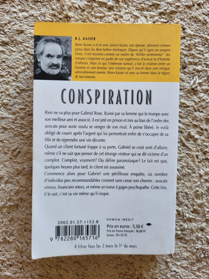 ⭐️ Nombreux livres dans mon dressing réductions sur les lots activées ✨️ 📚 Livre "Conspiration" de R.J. Kaiser 📕 Gabriel Rose, avocat ruiné et fraîchement sorti de prison, accepte un nouveau client. Quand ce dernier est assassiné, Gabriel devient suspect et se lance dans une course dangereuse pour découvrir la vérité et sauver sa peau face à des ennemis sans scrupules (avocats véreux, financiers corrompus, tueur à gages). 📖 Bon état, sans usure importante mais les pages ont jauni 📍 Thriller / polar, mêlant enquête, suspense et action, avec une touche de drame personnel