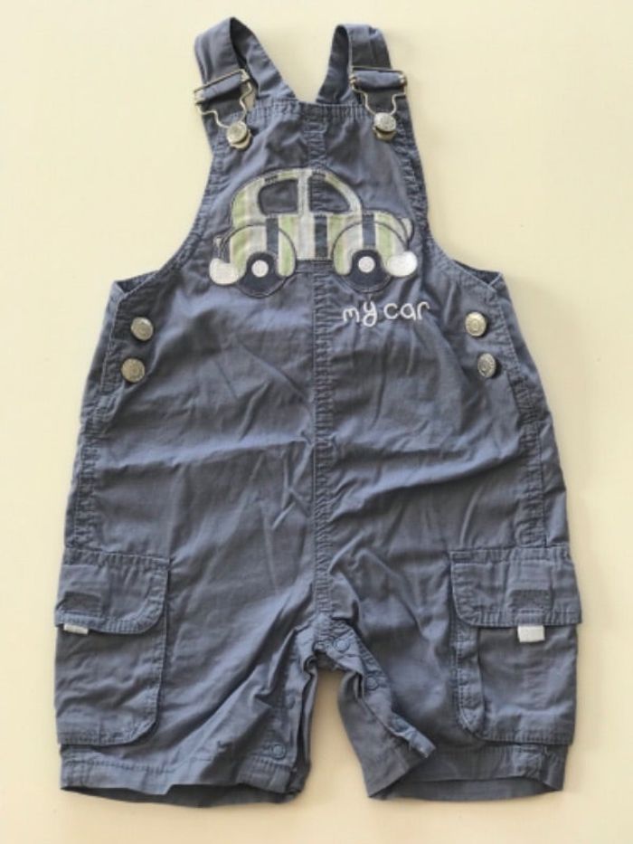 Salopette short bleu, ouverture par pressions sur le côté et entrejambe. Bretelles réglables et poches à scratch sur les jambes. 18 mois