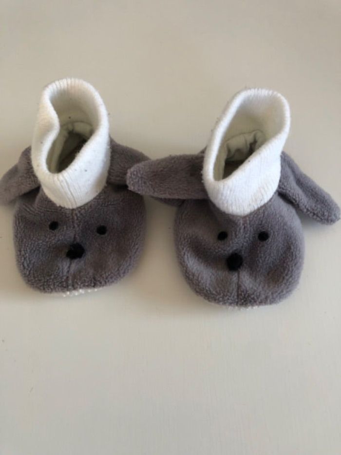 Chaussons grises chien, semelle antidérapante, pour pied large. Estimation de la taille, pour un bébé entre 6 mois et 1 an.