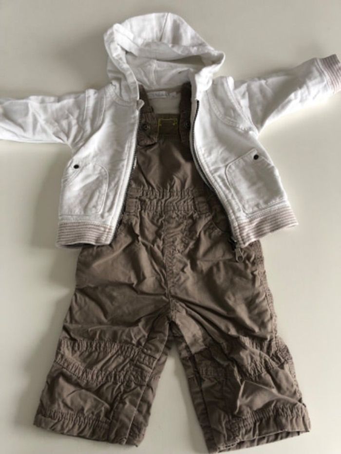 Ensemble salopette marron clair 100% coton, doublure 100% coton, ouverture par boutons pressions ainsi qu’à l’entrejambe. Sweat zippé blanc à capuche 100% coton. Tache présente à l’arrière de la capuche.