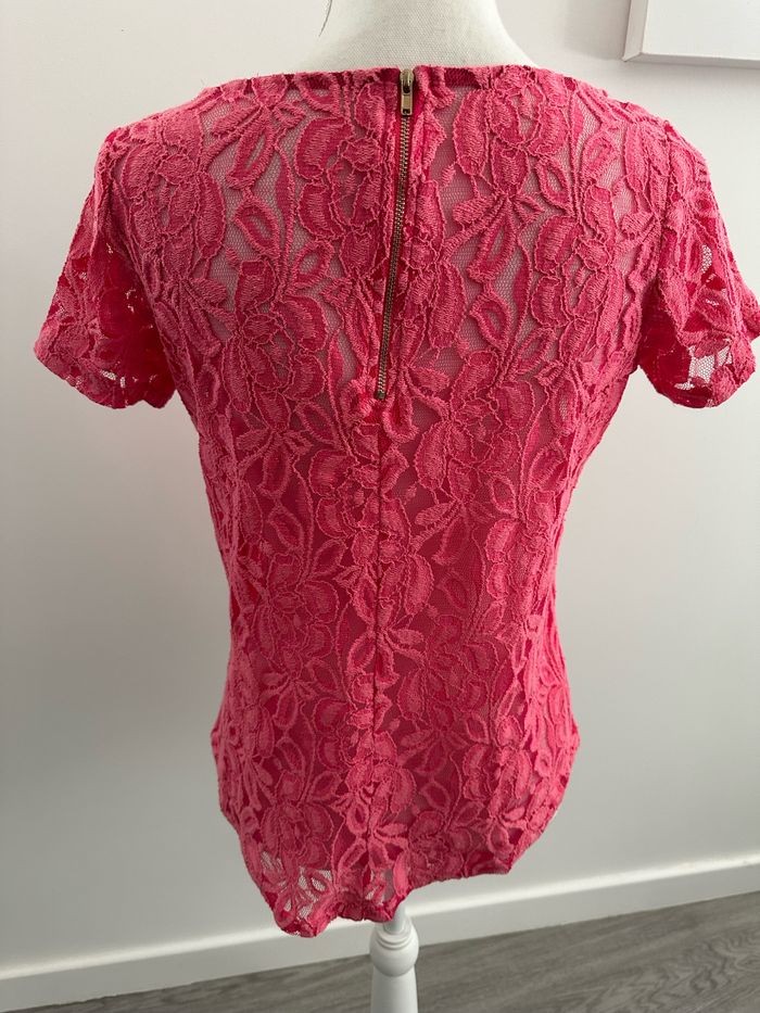 T-shirt - Excellent état - Taille 38 équivalent M Dimensions en bas de l’annonce - Couleur rose bonbon identique aux photos - Dentelle broderies mesh - Manches courtes - Zip dans le dos - Style Y2K - Tissus transparent - Pas d’étiquette de taille ni de matière Dimensions: - 50cm niveau aisselles - 54cm de long à l’avant - 60cm de long à l’arrière