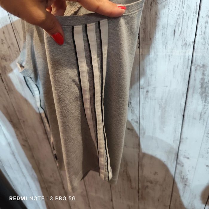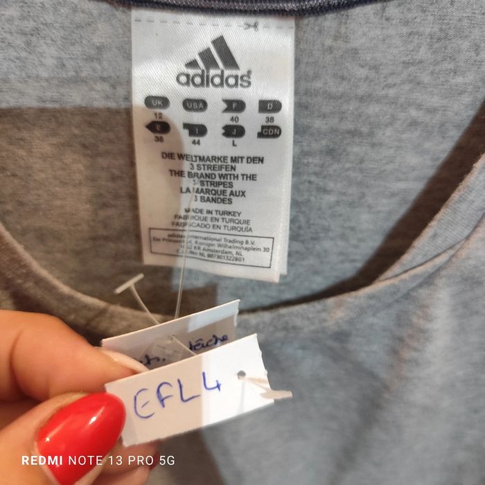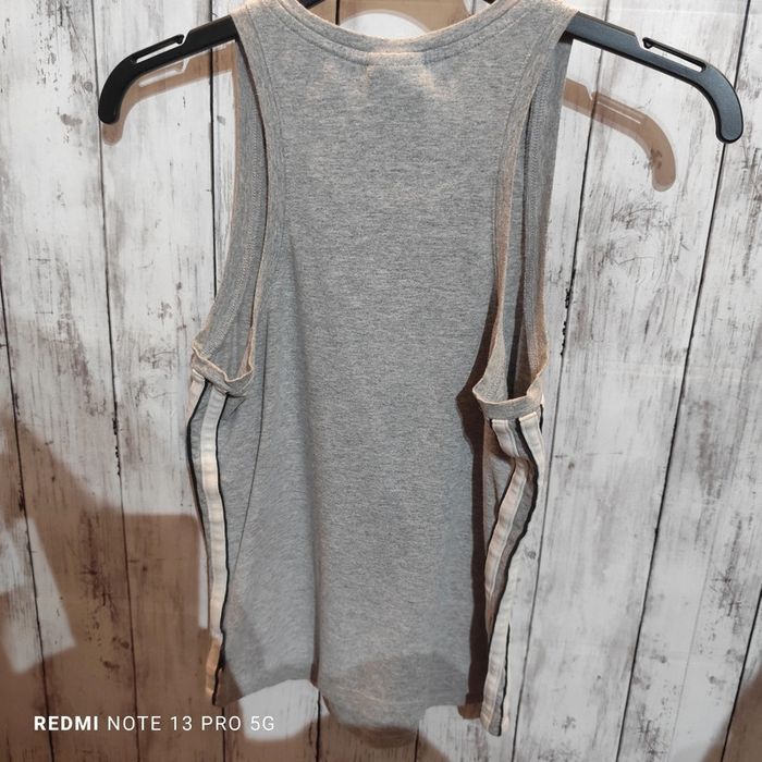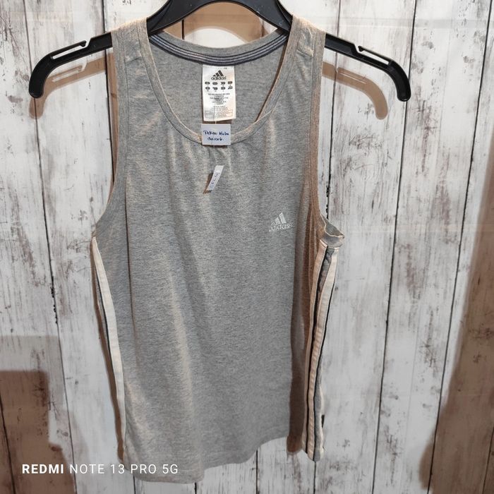 Débardeur adidas bande sur le côté. Petites tâches devant peu visibles ( Voir photos). Taille légèrement petit. J'ai énormément d'articles à vendre de la naissance à la taille M filles et garçons n'hésitez pas a demander si vous cherchez des articles. Je publie petit à petit mais vous pouvez me demander les tailles qui vous intéressent.