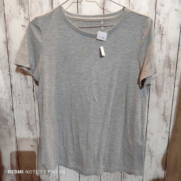 T.shirt gris et petits coeurs dorés discrets J'ai énormément d'articles à vendre de la naissance à la taille M filles et garçons n'hésitez pas a demander si vous cherchez des articles. Je publie petit à petit mais vous pouvez me demander les tailles qui vous intéressent.