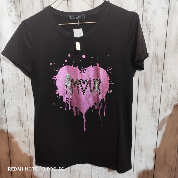 T.shirt noir avec coeur rose Je tiens une boutique de seconde main de la naissance à la taille M. J'ai énormément d'articles si vous recherchez quelque chose en particulier n'hésitez pas à me contacter je commence à peine a publier quelques articles!! Les envois se font le mercredi et le samedi si commande la veille avant 18h pour une commande urgente contactez moi avant de passer commande.