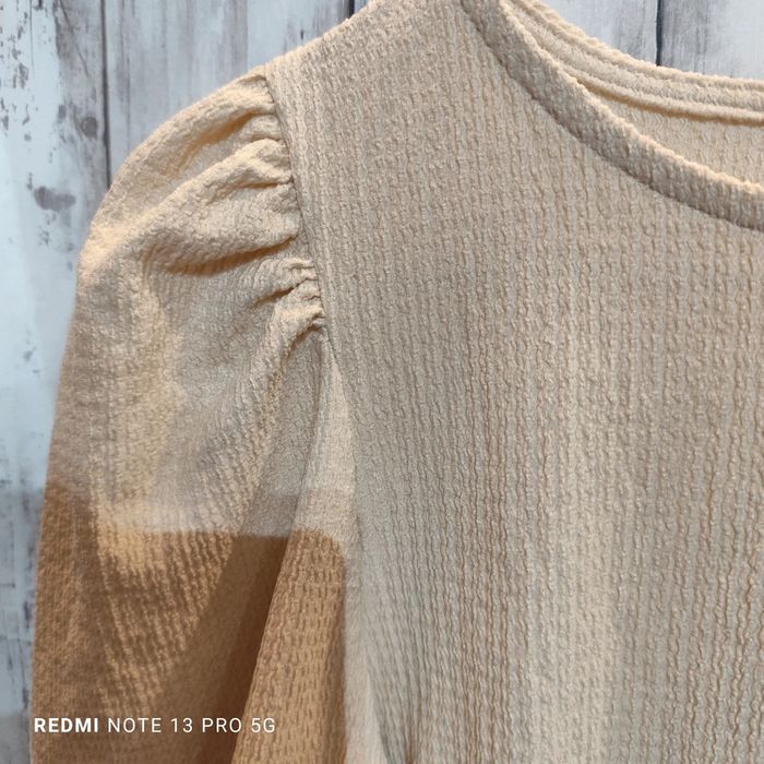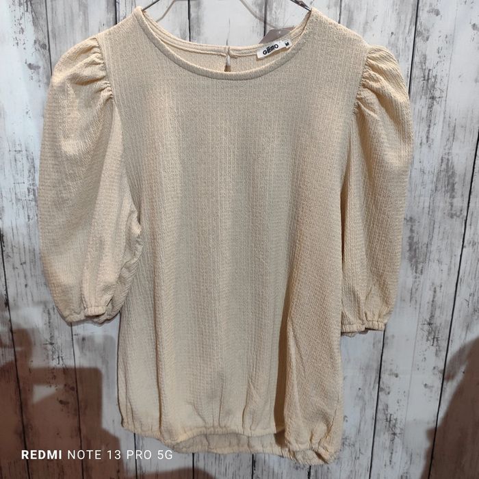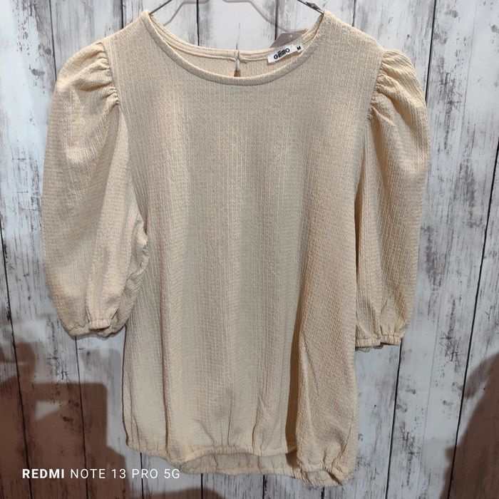 Haut en très bon état. Manches mi longues bouffantes Couleur crème Matière légère et maille légèrement gauffrée Je tiens une boutique de seconde main de la naissance à la taille M. J'ai énormément d'articles si vous recherchez quelque chose en particulier n'hésitez pas à me contacter je commence à peine a publier quelques articles!! Les envois se font le mercredi et le samedi si commande la veille avant 18h pour une commande urgente contactez moi avant de passer commande.