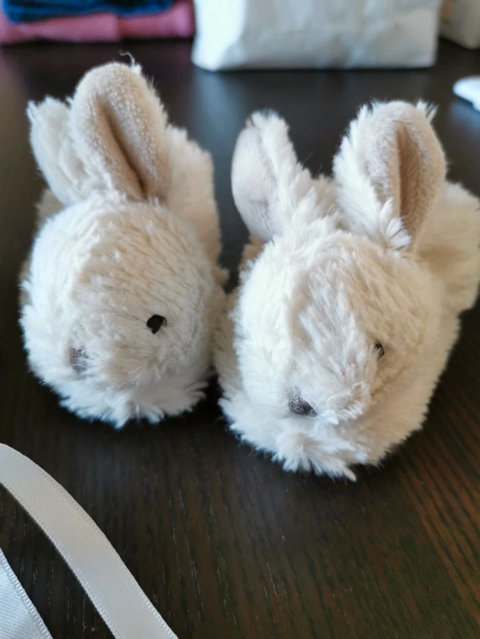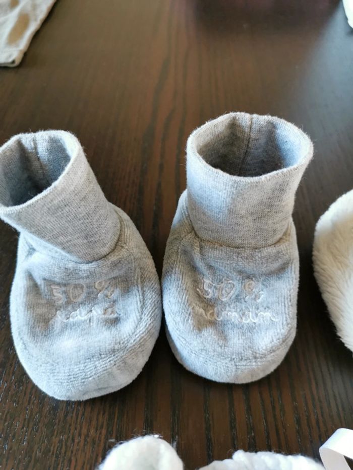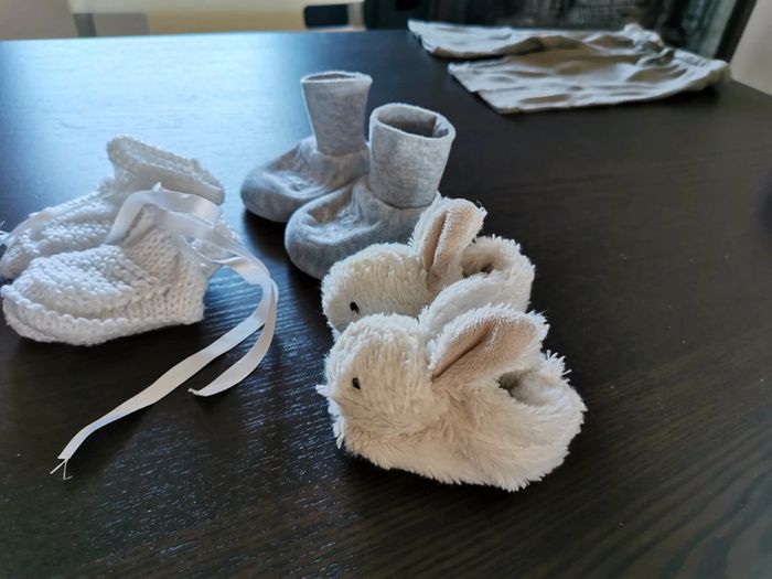 Lot de 3 chaussons mixtes. Celles en petit lapin sont toutes douces et ont des petites billes pour faire du bruit lorsque bébé bouge les pieds. Mon fils et ma fille les ont tous les 2 portés. Ma fille a peine quelques jours car elle avait de grands pieds. Celles en laine ont été faites à la main. N'hésitez pas à faire un lot des remises s'appliquent automatiquement. Je publie régulièrement des annonces j'ai des vêtements garçons de 1 à 36 mois et des vêtements filles de 1 et 3 mois pour l'instant. Si vous cherchez quelque chose n'hésitez pas à me contacter ou à vous abonner !! 😊😊😊
