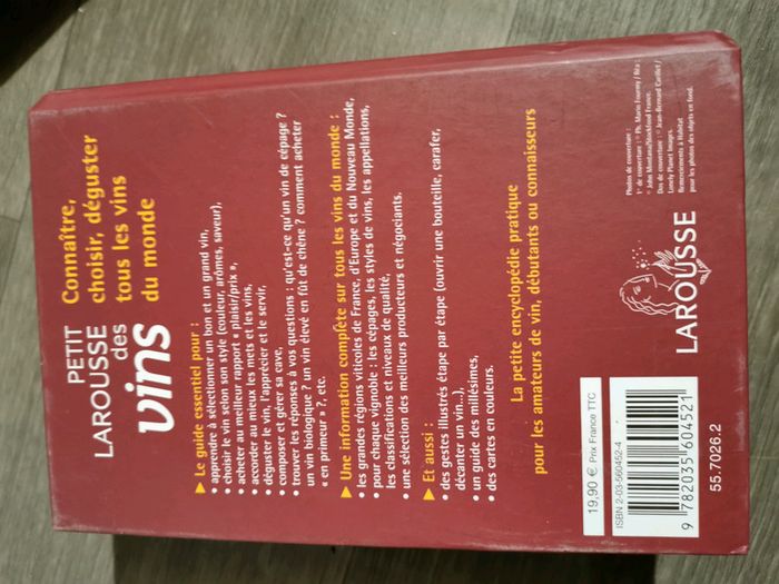 A vendre le Larousse des Vins Légèrement abîmé Merci de préférer l'envoi via shop2shop pour un envoi plus rapide le point relais est juste à côté de chez moi sinon je poste les colis dans les autres points relais le mercredi.