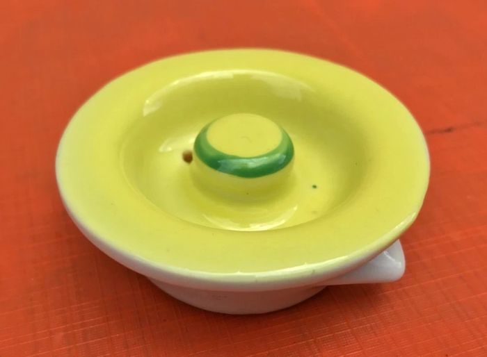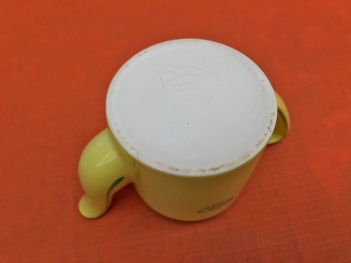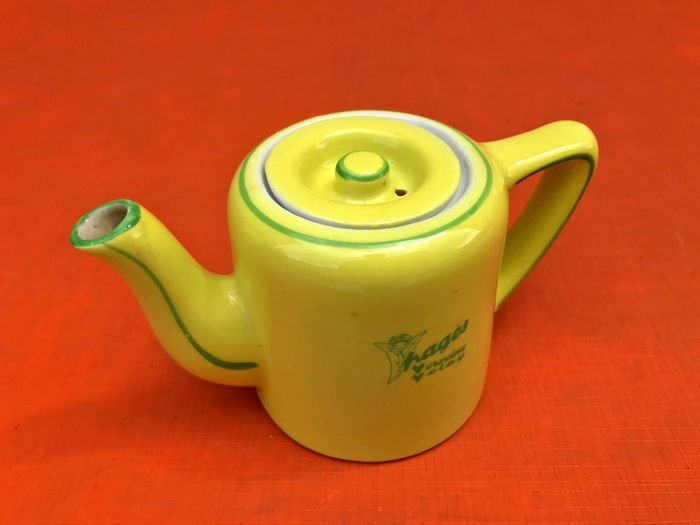 Théière publicitaire Thé Tetley Pagès Verveine Velay Céramique jaune liseré vert Contenance : 35cl Hauteur : 85mm Diamètre : 85mm Poids : 315grs