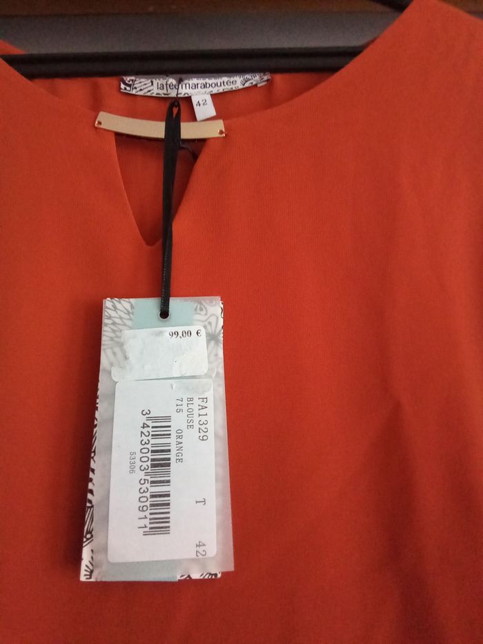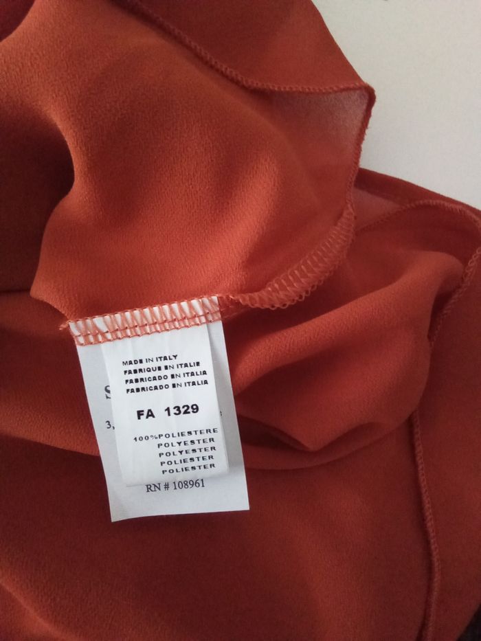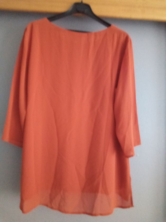 Blouse manches trois quart couleur brique longueur 65 cm, épaule à épaule 42 cm. 100% polyester